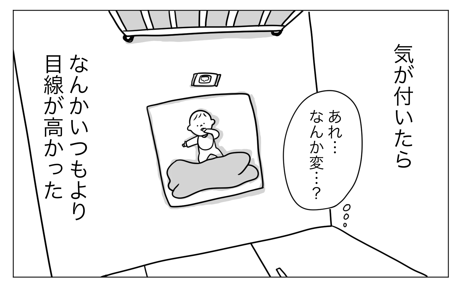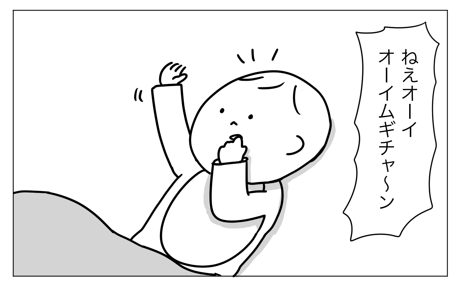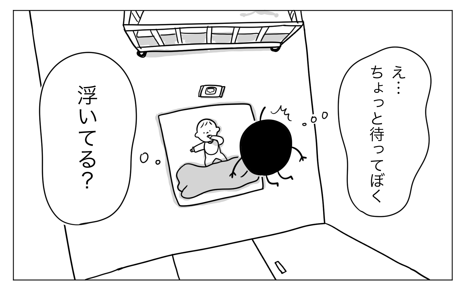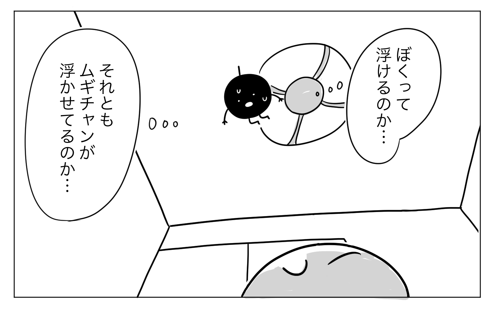 ムギちゃんは目に映るイマジナリーフレンドを触ろうと、手を伸ばしたのでしょう。その瞬間にフレンドではなくて自分の手に興味が移った…。宙から降りられない、ムギちゃんも見てくれない、そんなフレンドの慌てる姿がなんとも愛くるしいですね。