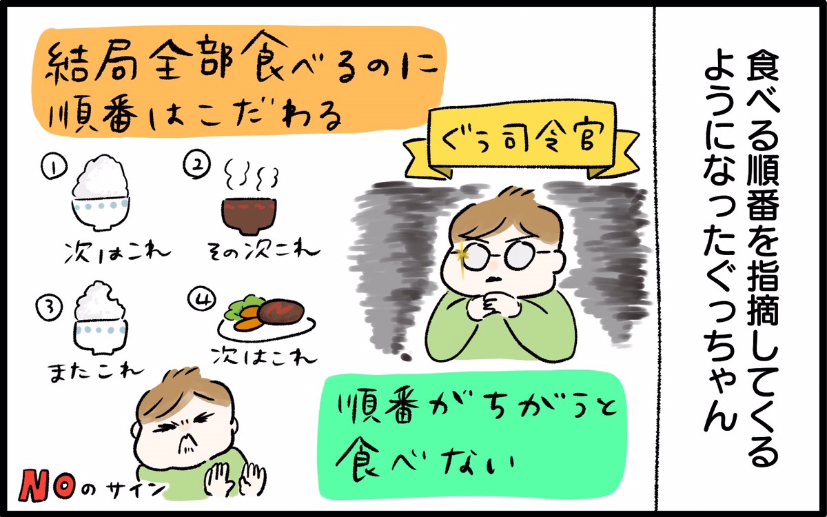 離乳食期の子どものこだわりは「ママ泣かせ」と感じるかたも多いのではないでしょうか。遊び食べや好き嫌いの他にも、食べる順番の指示をする息子・ぐっちゃんの姿に共感させられますね。