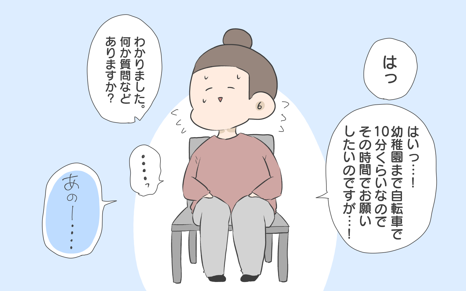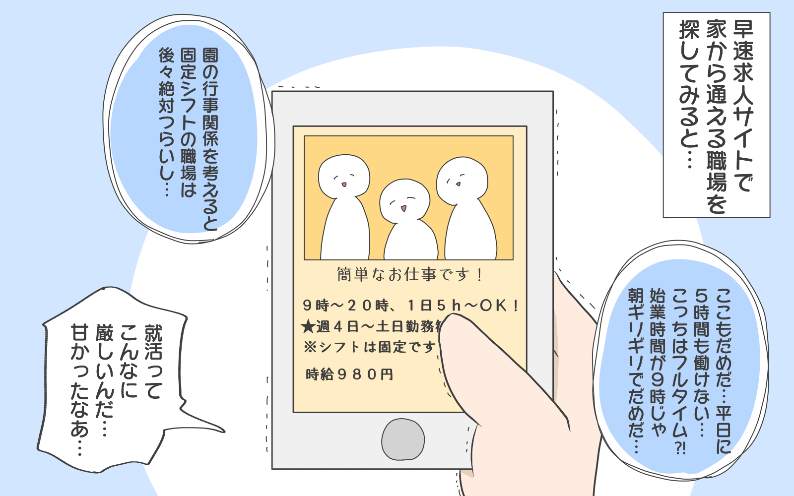 希望の形で働きに出るまでに、3ヶ月かかりました。幼稚園に通わせながら、自分も働くことのハードルの高さを痛感した3ヶ月でした。育児にかかりきりの環境から外に働きに出ようとすると、「自分には何ができるのだろう。知らぬ間に社会から遠ざかっている…。」そんな孤独感との戦いだった気がします。「今の私が働くには、もっと条件を妥協して探さなければならないのでは?」と日々悩みました。