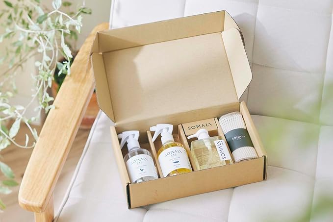 他の人と被らないユニークな手土産なら、お掃除セット「ソマリ」がおすすめです。こちらは台所用石けん、トイレクリーナー、バスクリーナー、台所用クロススポンジが入ったギフトボックスです。