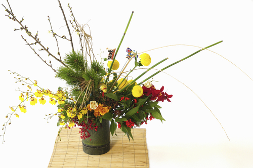 いけるときは、前の花に重ならないようにするのがポイントです。余分な枝や葉は省いていきましょう。最後に水引を飾ることで、お正月らしさがアップしますよ。