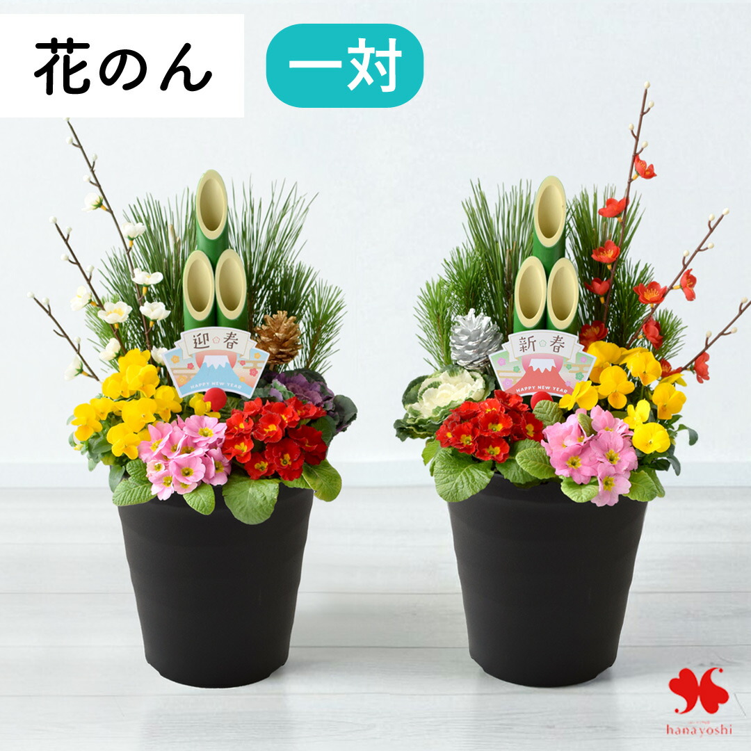 門松+生け花+寄せ植えが融合したゴージャスなお正月のフラワーアレンジメントです。松竹梅、葉牡丹、ジュリアン、ビオラなど、和洋の花がバランスよく配置されています。デザイン鉢に入っているので、そのまま飾れますよ。部屋や玄関先に置くと良いでしょう。