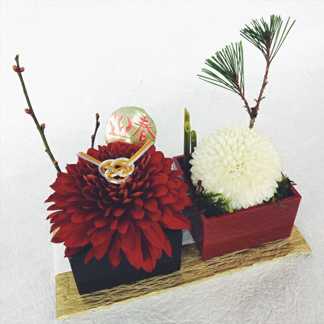 紅白のピンポンマムと縁起の良い松竹梅を飾りつけた和風アレンジメントです。紅白の水引も飾られ、新年を迎えるのにふさわしいデザインになっています。花器には升が使われてモダンな雰囲気。和洋問わずおしゃれに楽しめます。