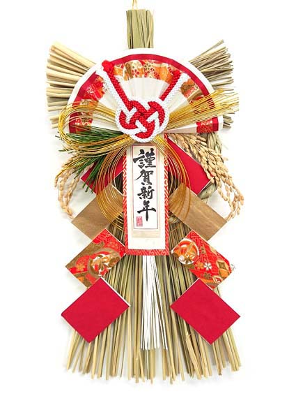 新潟県南魚沼市で一つひとつ丁寧に作られたしめ飾りです。サイズは縦約38cm横約20cmで、玄関先に無理なく飾れるサイズです。扇や水引、御幣など、縁起物が豪華に飾られていますよ。格式高く、存在感のあるしめ飾りです。