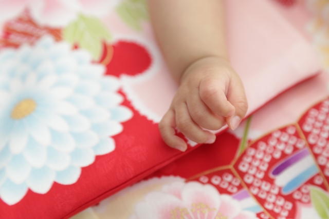 お食い初めでは、今までの白い産着を着ている時期から色ものの晴れ着を着るという意味を込めて成長を祝う地域もあります。ご家庭によっては実家の祖父母から小袖が贈られ、それを着るという慣習がありますよ。