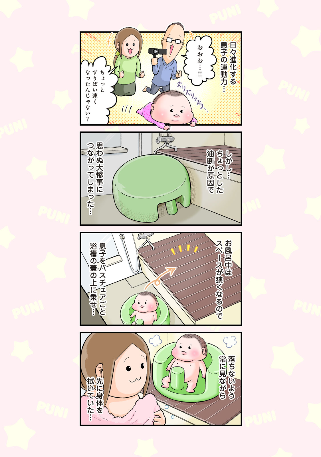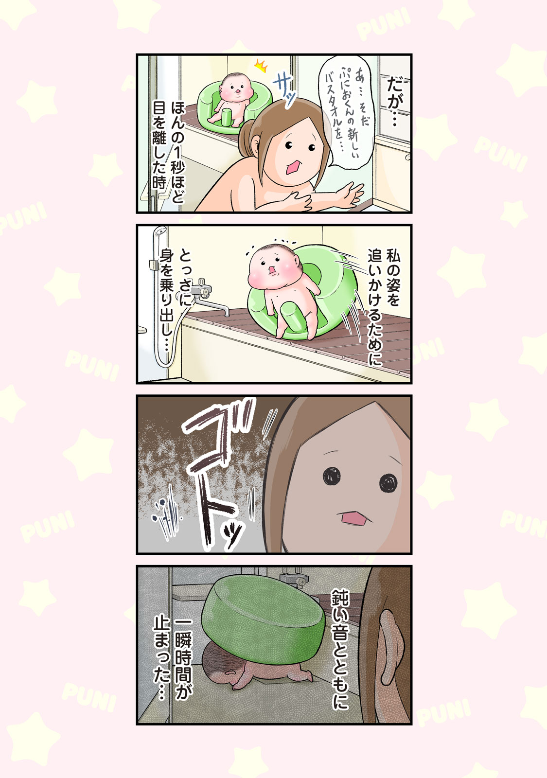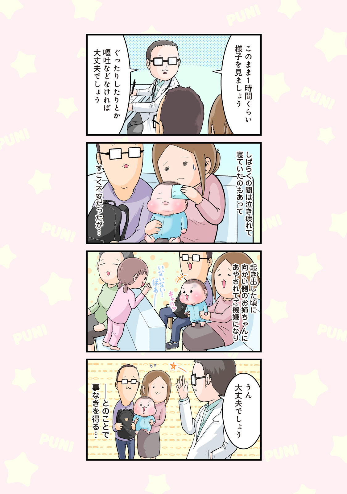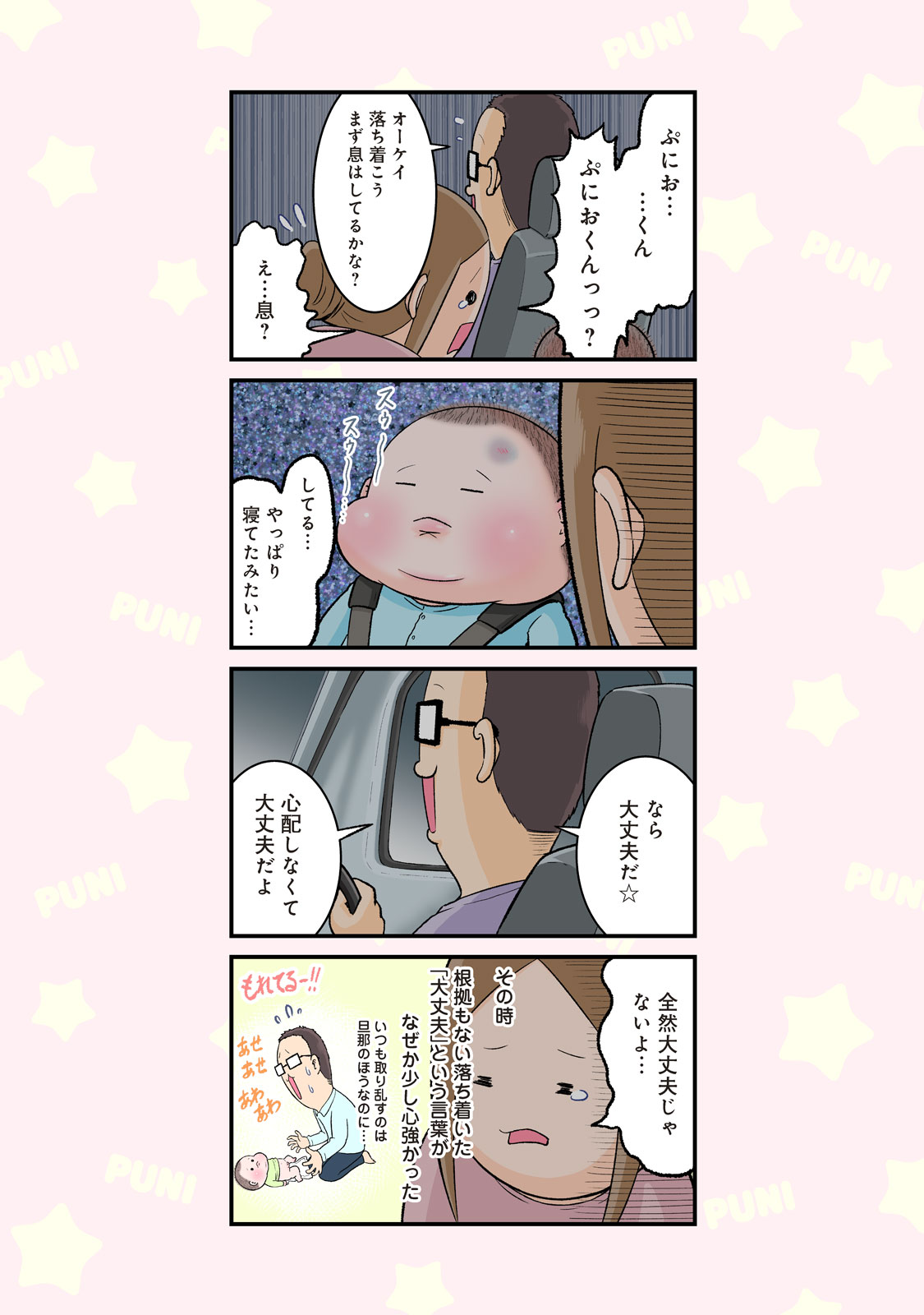 赤ちゃんがケガをしたとき、自分を責めてしまう方も少なくありません。赤ちゃんケガが命に関わったらどうしよう…という気持ちを経験したママも多いでしょう。ぷにおちゃんのことを心配する思いが伝わってくるシーンです。
