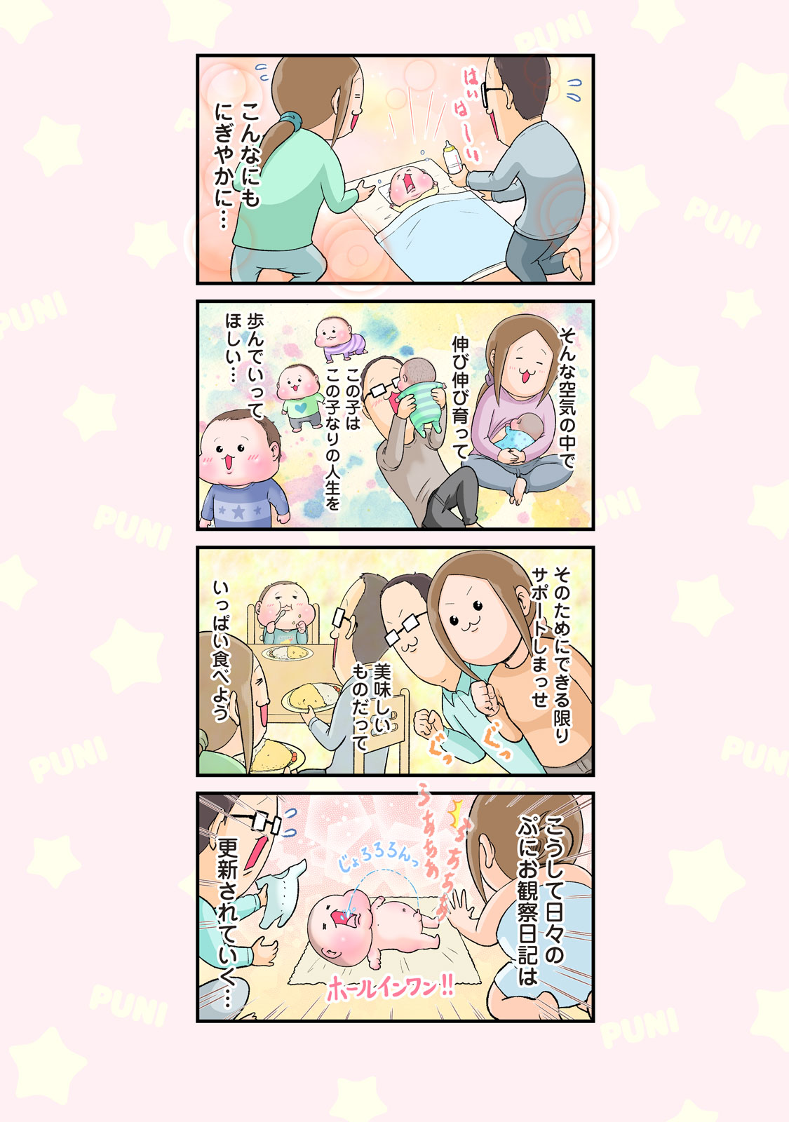 ぷにぷになほっぺ、思わずさわりたくなるまるまるとしたお腹、自分の気持ちに率直に生きるつぶらな瞳。愛されキャラのぷにおちゃん。これからもすくすく元気に成長して、世界に愛と癒やしを届けてくれることを期待しています!(ままのて編集部)
