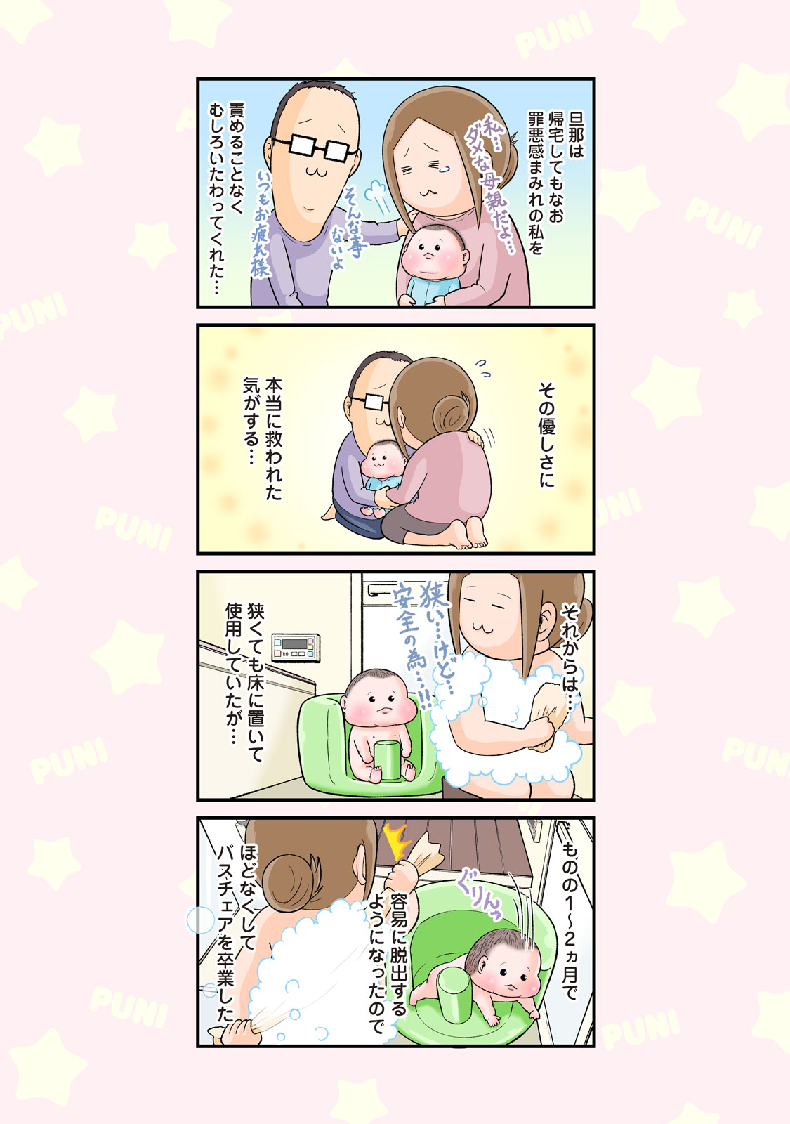 赤ちゃんに危険がおよんだとき、自分自身を責めてしまうママもいるでしょう。罪悪感にさいなまれたときに、夫から優しい声をかけられて救われたというにくきゅうぷにおさんの気持ちがひしひしと伝わってきますね。