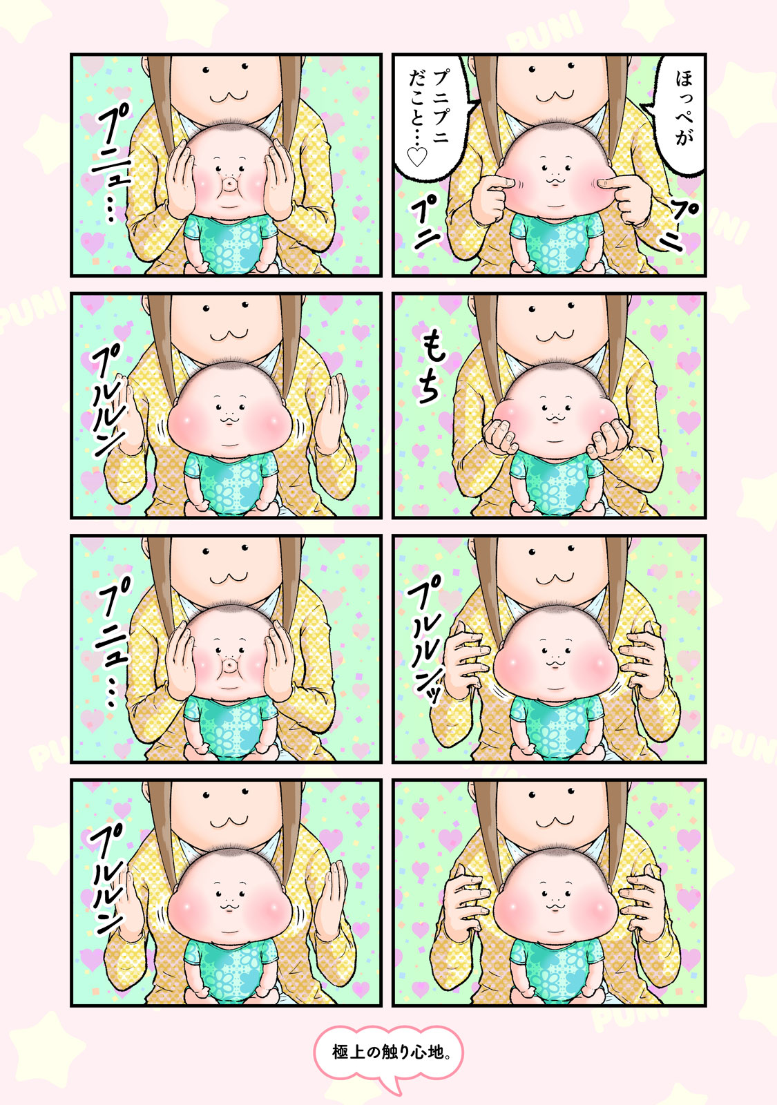 ぷにおちゃんの最大の魅力は、思わずさわりたくなるぷにぷになほっぺではないでしょうか。ほっぺを押したりやわらかく引っ張ったり、タプタプと持ち上げたり、ぷにおちゃんとたくさん遊べるママがうらやましいですね。
