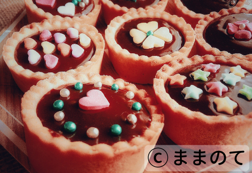 生チョコを市販のタルトに入れて固めた一口サイズのミニタルトです。生チョコを切ったり、ココアをまぶしたりしないので、不器用な方でも気楽に作れますよ。デコレーションにはアラザンやハートシュガーなどを使い、かわいく仕上げてみてくださいね。
