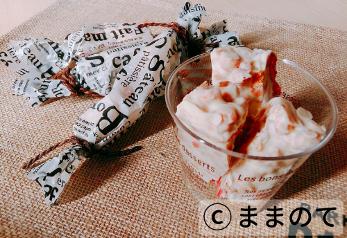 市販のホワイトチョコレートとグラノーラを混ぜて固めたチョコバーです。いちごグラノーラを使っているので、バレンタインらしい色合いになってかわいいですよ。フルーツグラノーラのレーズンが苦手な方におすすめです。