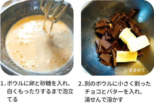 2.別のボウルに小さく割ったチョコとバターを入れ、湯せんで溶かす