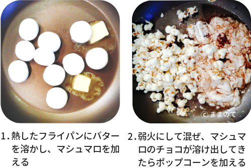 1.熱したフライパンにバターを溶かし、マシュマロを加える