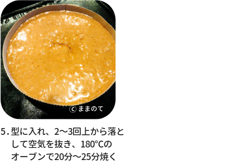 5.型に入れ、2~3回上から落として空気を抜き、180℃のオーブンで20分~25分焼いたら完成