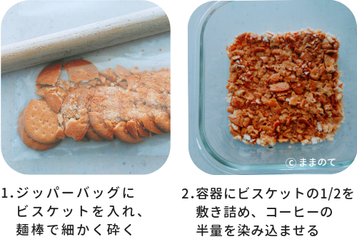 2.容器にビスケットの1/2を敷き詰め、コーヒーの半量を染み込ませる