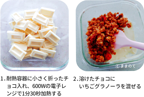 1.耐熱容器に小さく折ったチョコを入れ、600Wの電子レンジで1分30秒加熱する