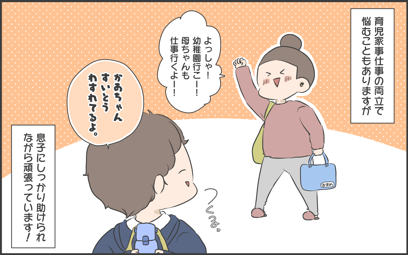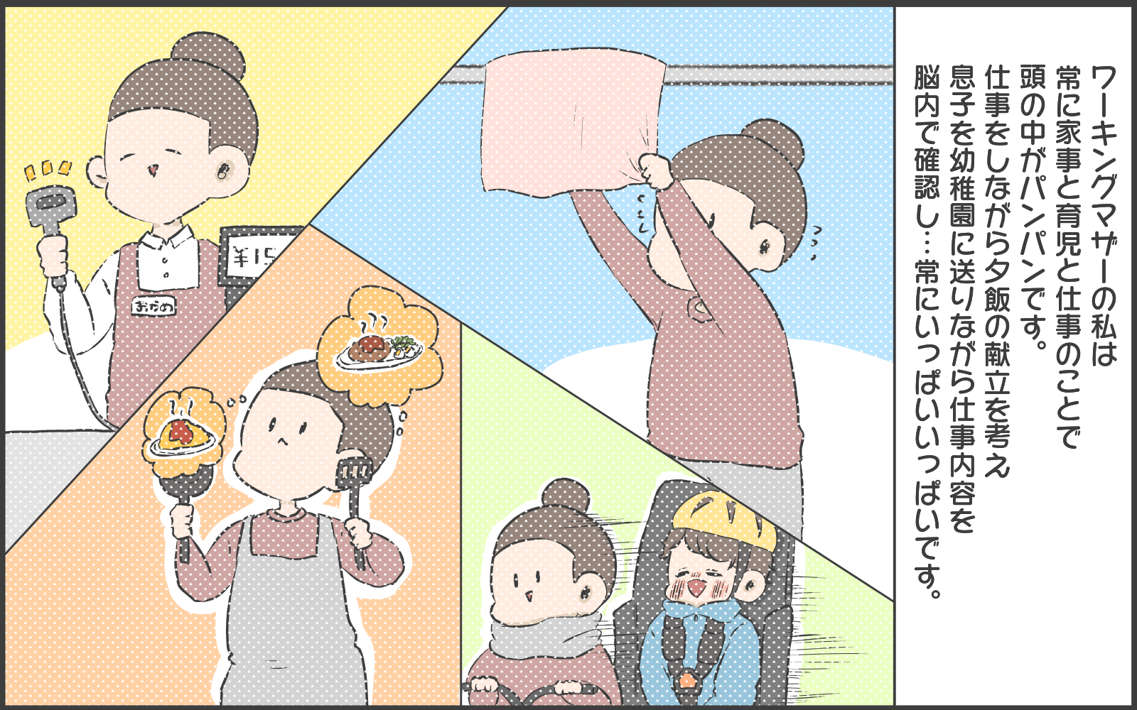 育児マンガ家おかめ(@omame_okame)さんが描く!ワーキングマザーの日常の出来事や奮闘をマンガでお届けします。日々大忙しのおかめさんの頭の中は常にパンパン!そんなママをみかねた息子・おまめくんががとった行動とは…?