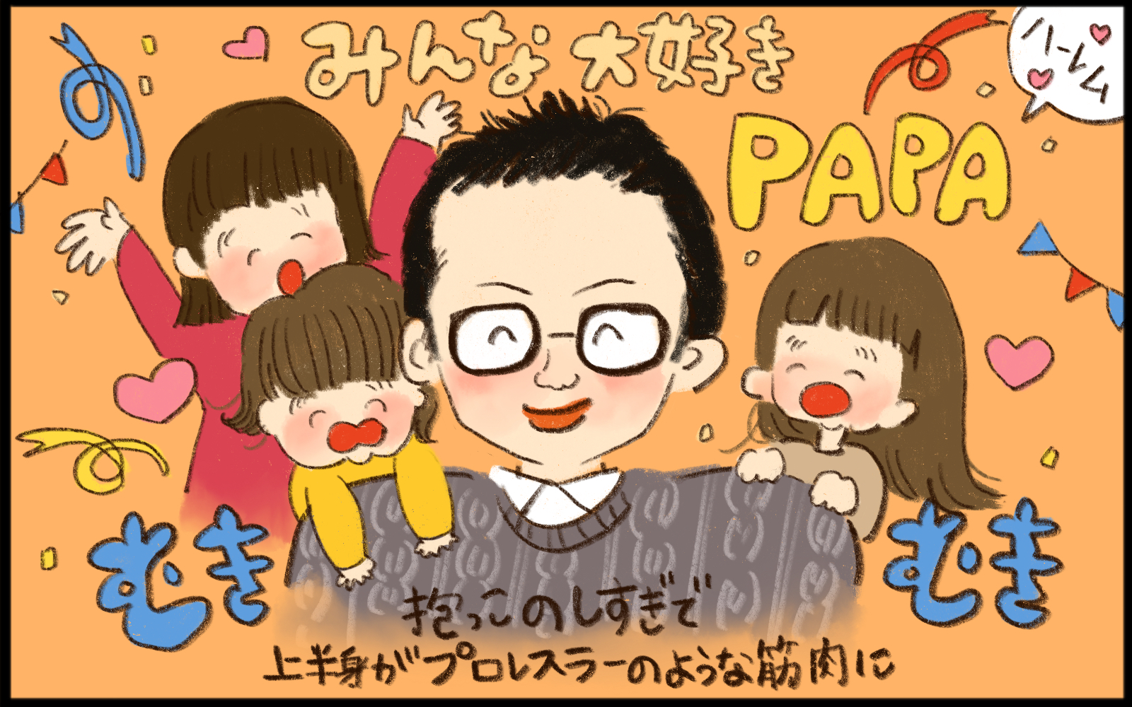 また、パパは愛する娘たちを"ハニー"と呼んでいます。保育園のお迎えのときもさっちゃんのことを「ハニーちゃん!」と呼び、さっちゃんも嬉しそうに「パピー!」と応えハグするそうです。保育園ではちょっとした名物パパになっているのではないかと思います。