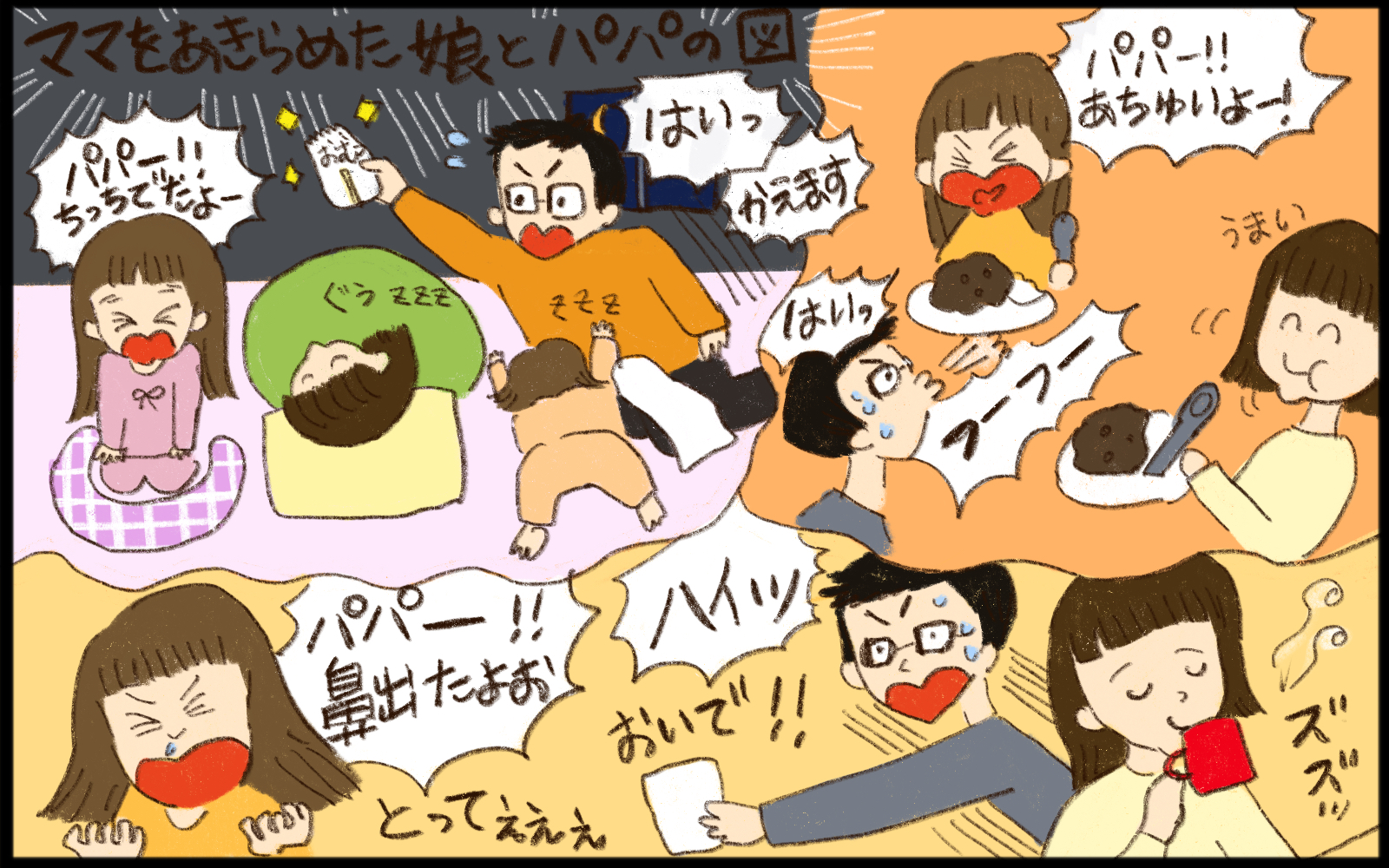 年子育児の日常を描くエッセイマンガ!おおもりなつみさんが描く、あたたかくてかわいいイラストとコラムをお届けします。優しくて頼りがいのあるパパに甘やかされる幸せな毎日!一家の大黒柱として、今日もパパは自由気ままな女性陣の要望に応えていく…!?