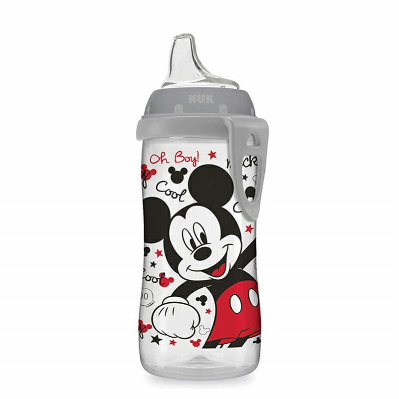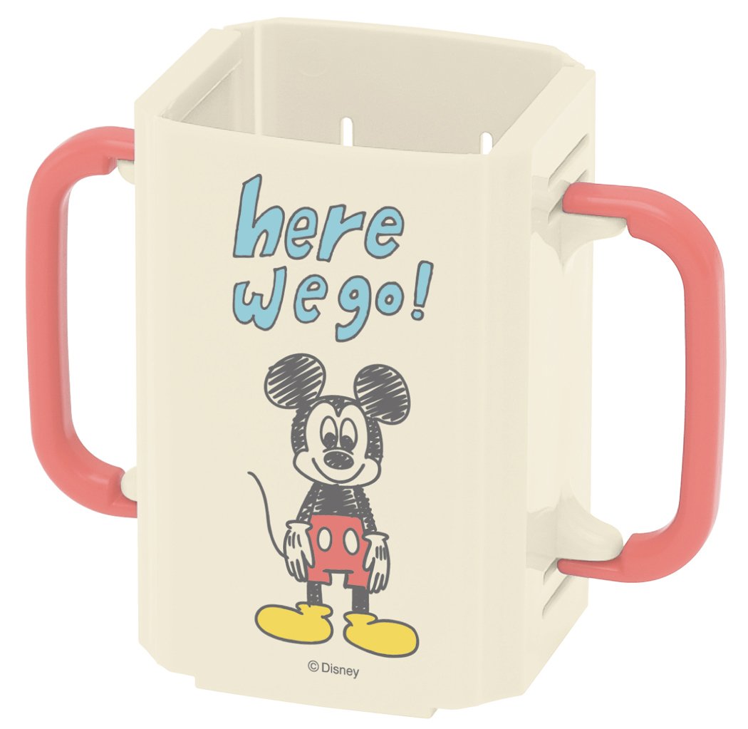 かわいいレトロなミッキーマウスがついた、ハンドル付きドリンクホルダーです。紙パックのジュースやお茶をそのまま赤ちゃんに持たせるとぎゅっと握りすぎて飲みものがこぼれてしまいがちですが、このホルダーがあればそういった心配がありません。