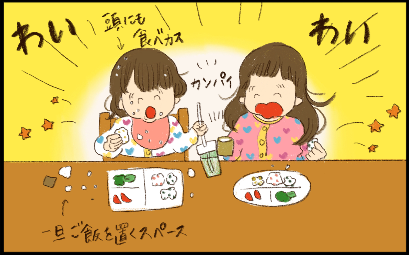 隣ではさっちゃんが一緒にご飯を食べているので、お互いに「あーん」させ合ったり、コップで「かんぱーい」したり姉妹で楽しく食事をしています。ご飯のこぼし方は豪快ですが、「それも食育♪」とおおらかに見ています。