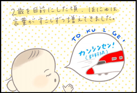 子どもが言葉を覚えたてのころ、さまざまな言い間違いをしてかわいらしいなと思うことがありますよね。ほにゅくんが「シンカンセン」を「カンシンセン」と得意げに言うシーンも、ほんわかさせられる貴重な思い出になることでしょう。