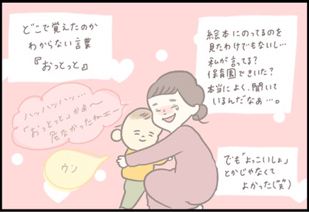 同時に言葉を覚えたての子どもが、「どこで覚えたの!?」という言葉を言うこともあります。つぶみさんも、ほにゅくんの「おっとっと」という言葉に驚いたとのこと。子どもの成長が感じられて微笑ましいですね。