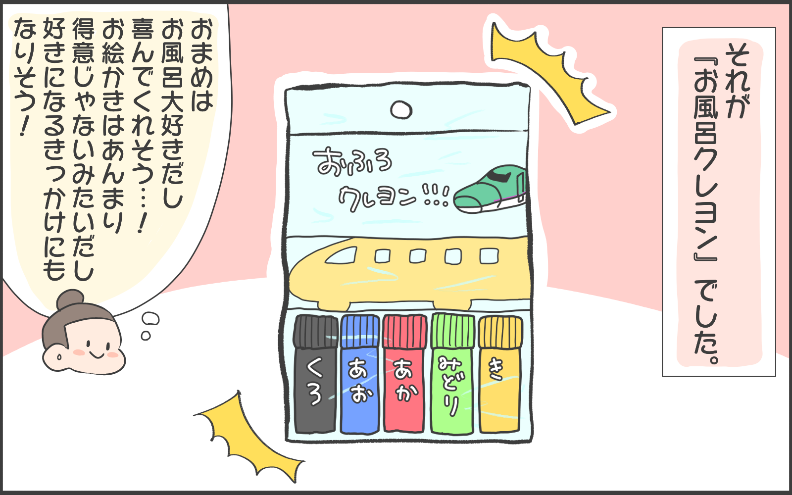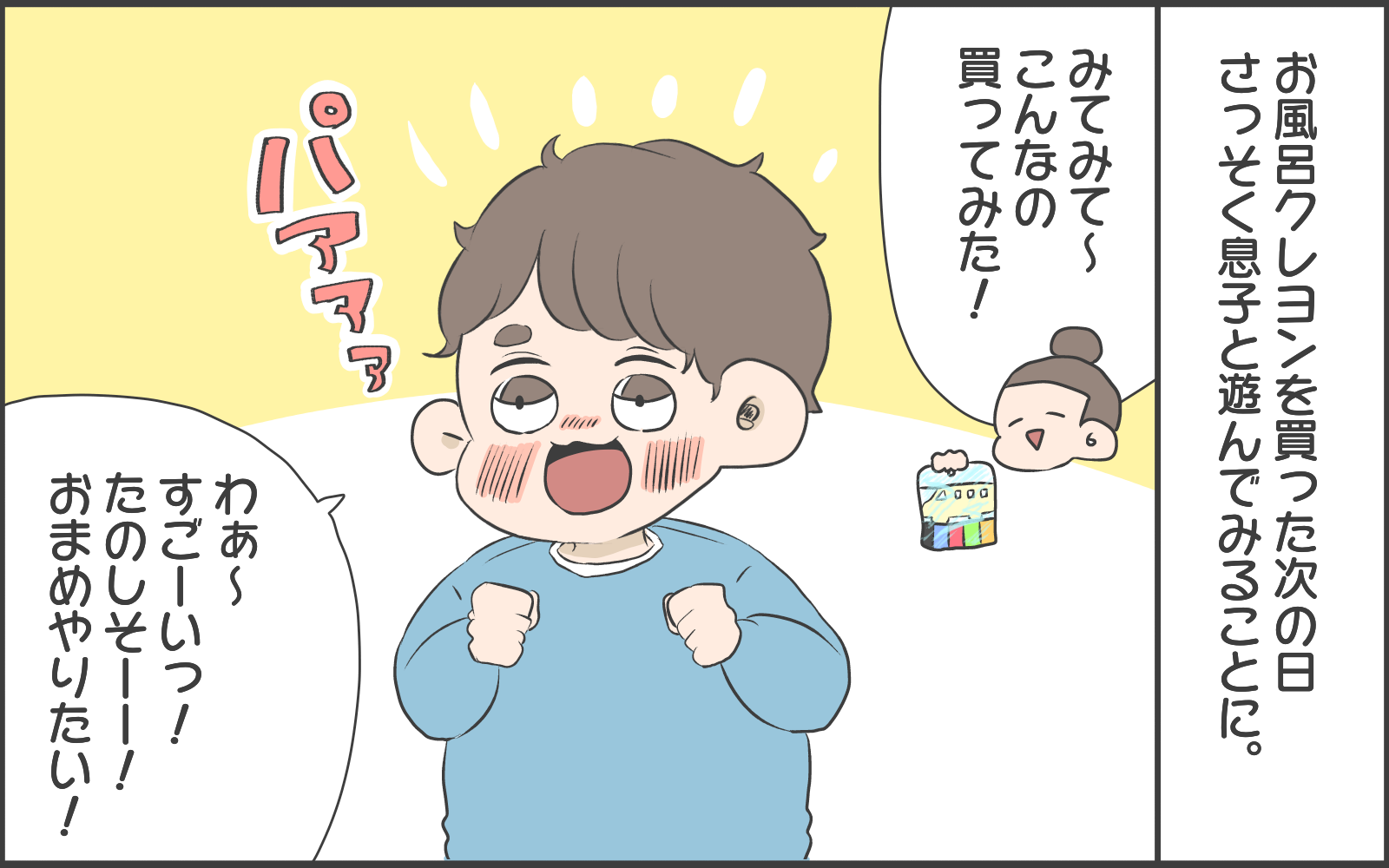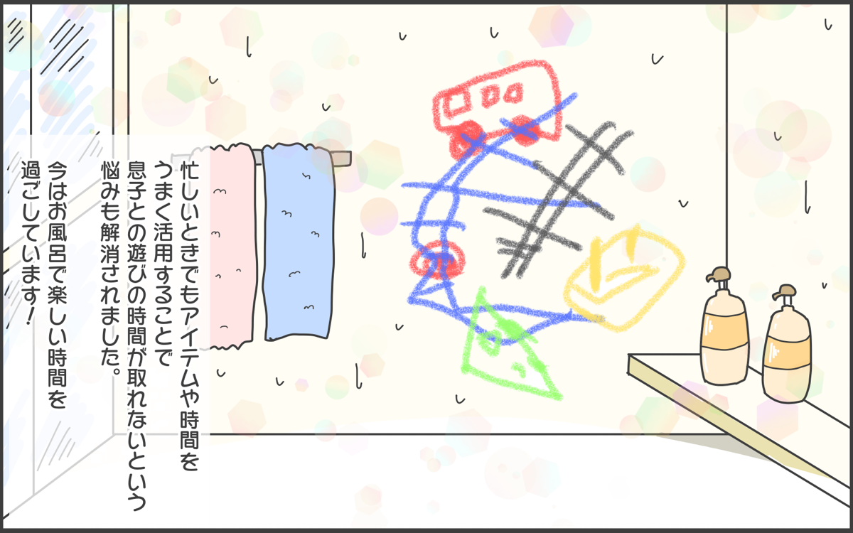 お絵かきが苦手だったおまめくんですが、楽しそうにお風呂の壁いっぱいに絵を描くおまめくんに編集部一同メロメロです…!