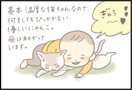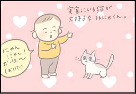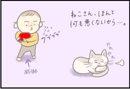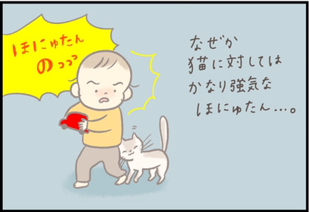 編集部員Yが最初に拝見したとき、つぶみさんの息子・ほにゅくんとネコちゃんとの関係がきょうだいみたいで、なんてかわいらしいのだろうと思いました。そのことをつぶみさんに伝えると「私にはライバルのようにも見えました」とのお返事をいただきました。ペットといえばハムスターしか飼ったことがない編集部員Yは、「なるほど!ライバル…!」と新たな子どもとペットの関わりを感じた気がします。