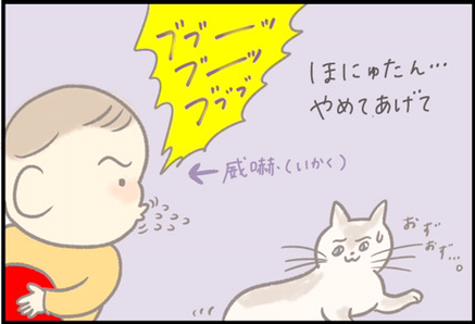 「ブブブー」と威嚇(いかく)するほにゅくん。それに対して「やれやれ」と一息をつくネコちゃんとの関係にとてもほんわかさせられますね。