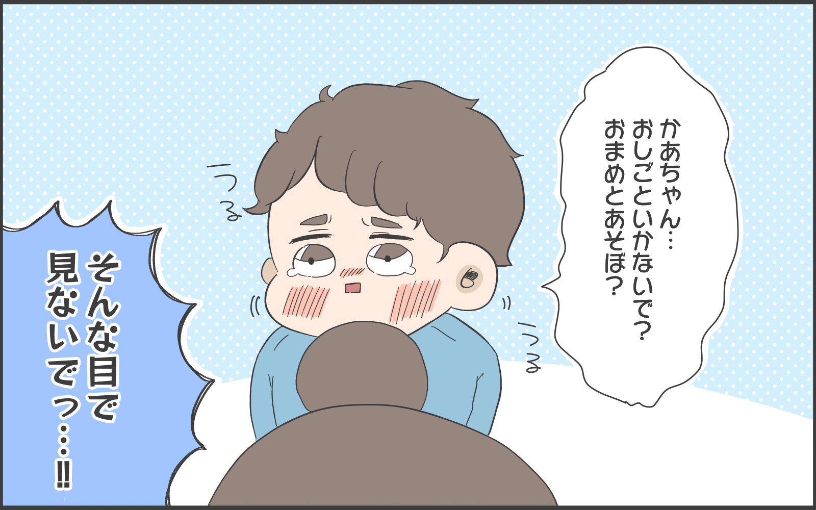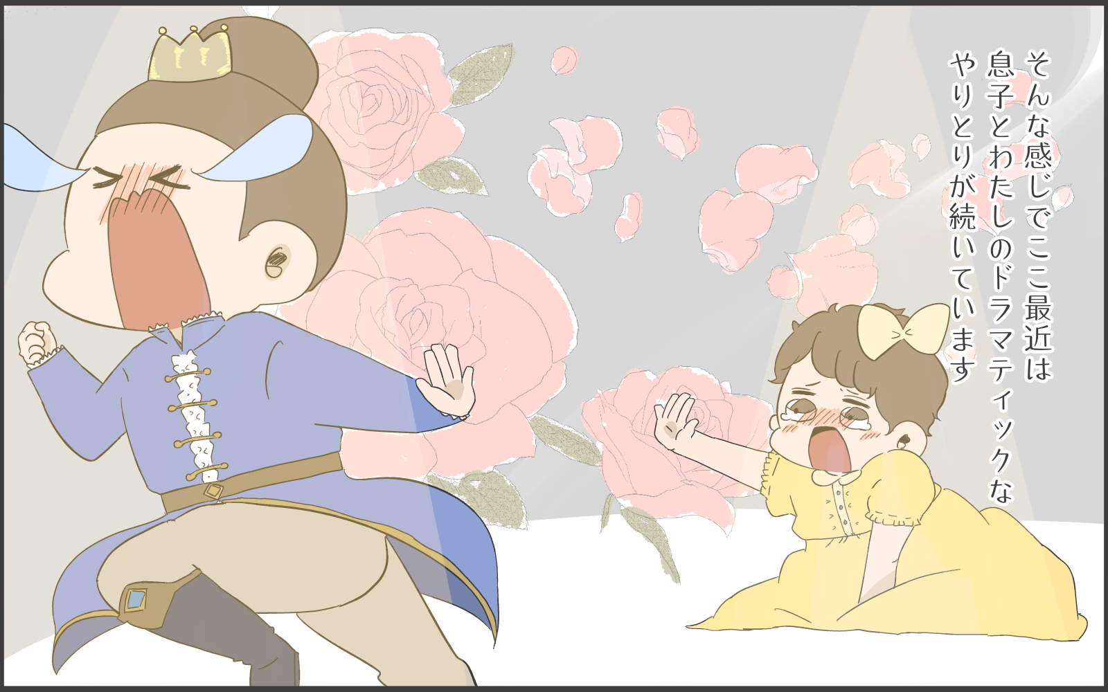 しかし、おまめくんは逆だったようです!「お仕事行かないで…」と瞳を潤ませるおまめくんに危うくハートを持っていかれそうになってしまいますね。仕事に行くだけなのに、今生の別れのようなドラマティックな掛け合いに、編集部は思わずとある国の王子様とお姫様を思い起こしてしまい、急遽最後のコマを追加していただきました…!