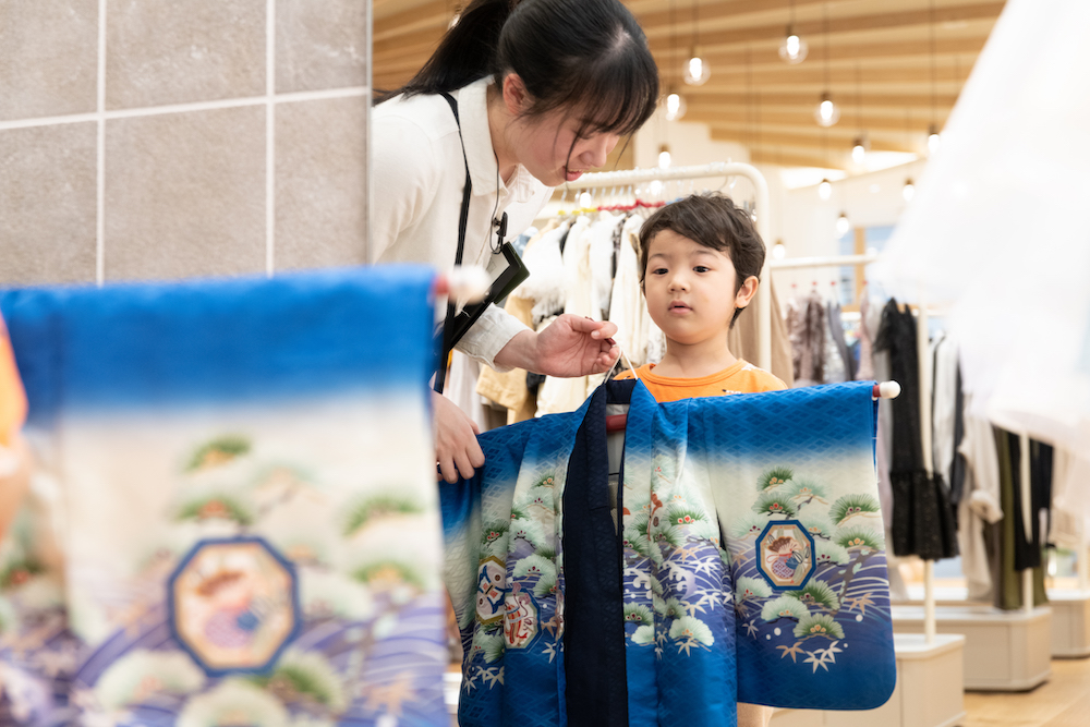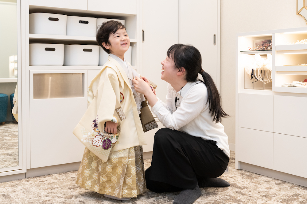 撮影前に緊張しているお子さまもいらっしゃるので、リラックスしてもらえるようにたくさんお話ししながら着付けをしています。