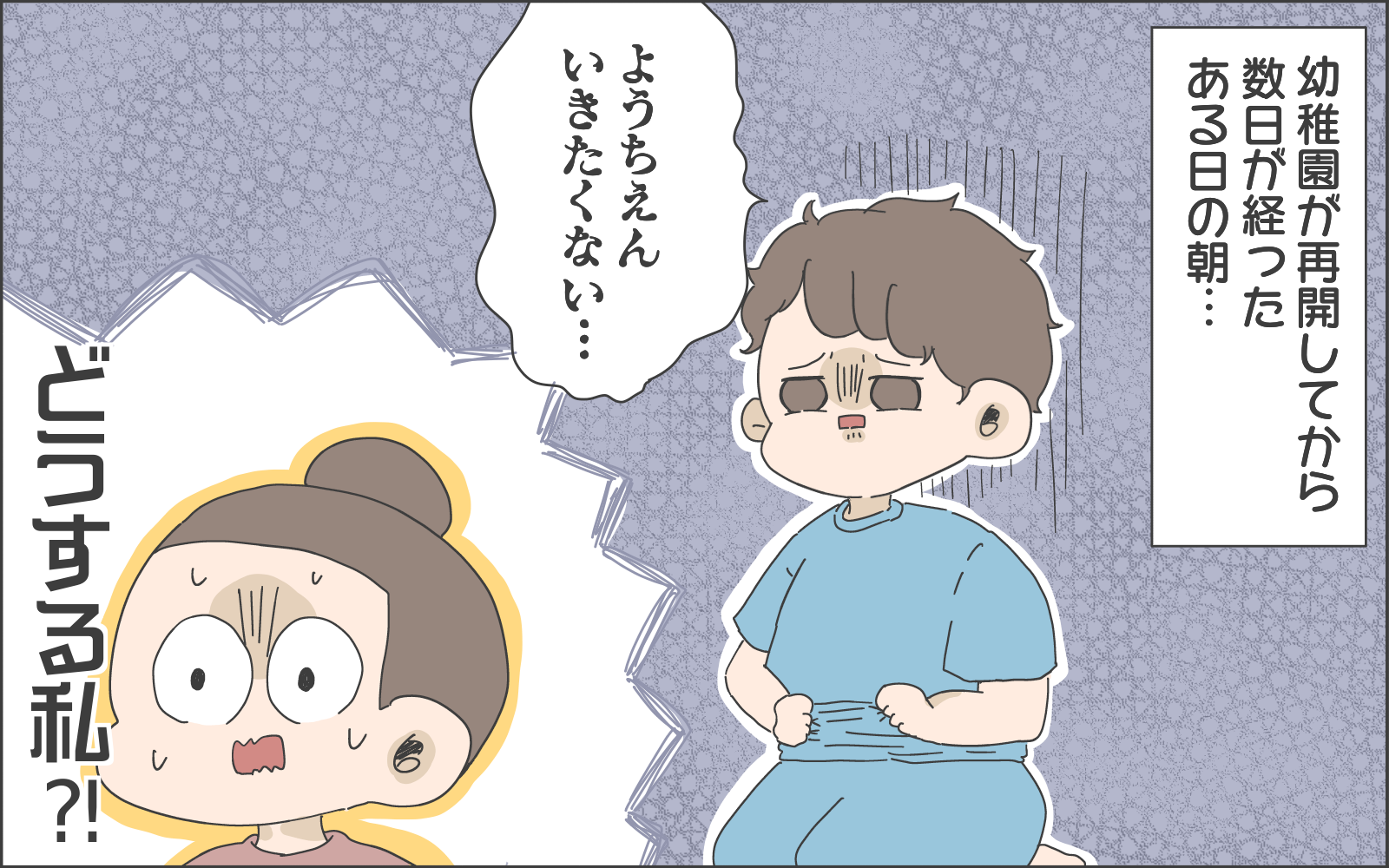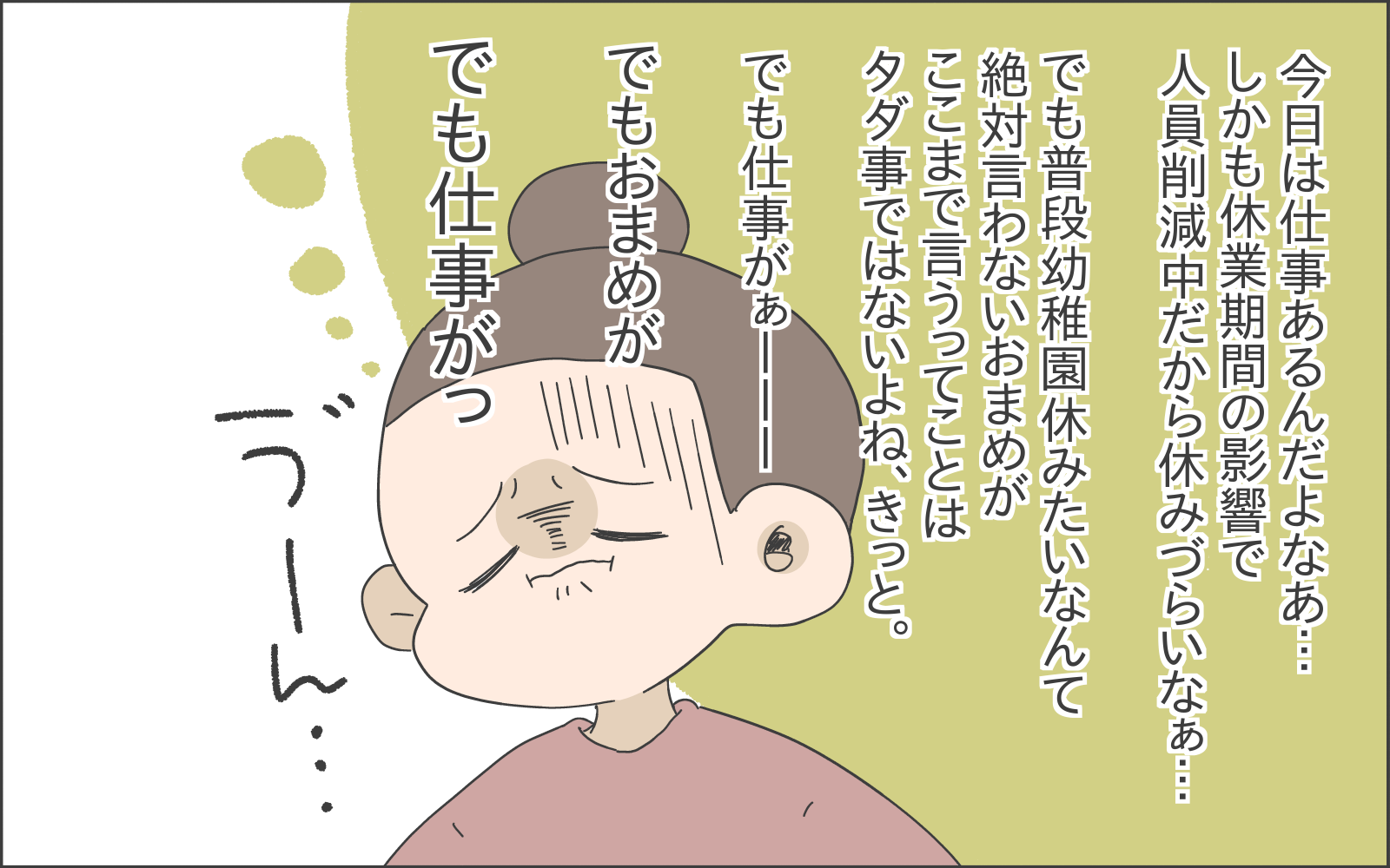 育児マンガ家おかめ(@omame_okame)さんが描く!ワーキングマザーの日常の出来事や奮闘をマンガでお届けします。ある日の朝、息子のおまめくんが突然「幼稚園に行きたくない」と告げられたおかめさん。息子と仕事のあいだで揺れるおかめさんはどのような決断をとったのでしょうか…?