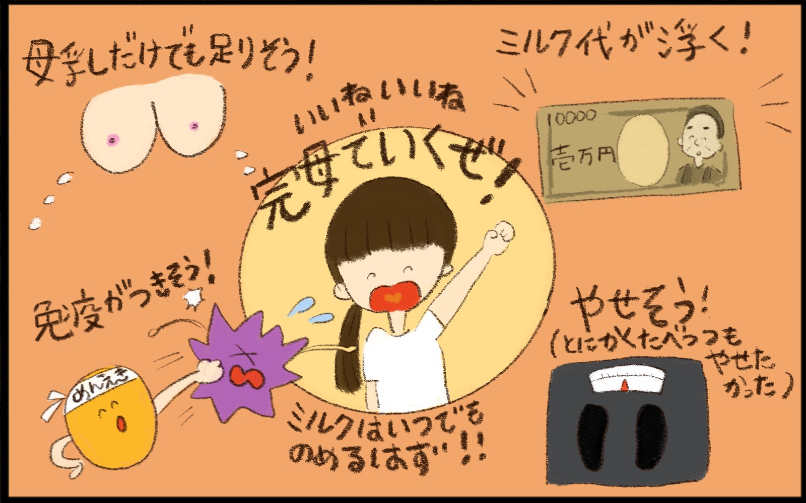 第1子のさっちゃんの出産時には、ミルク代を節約できるという点や産後太りを解消したいという点から、完母育児をしようと心に決めていました。さっちゃんが生まれる前にミルクを購入していましたが、「母乳が出ているからミルクはあげなくて大丈夫!」と数ヶ月は母乳のみで過ごしました。また、少し授乳の間隔があくと胸がパンパンに張るため、ミルクをいつあげていいかもわかっていませんでした。