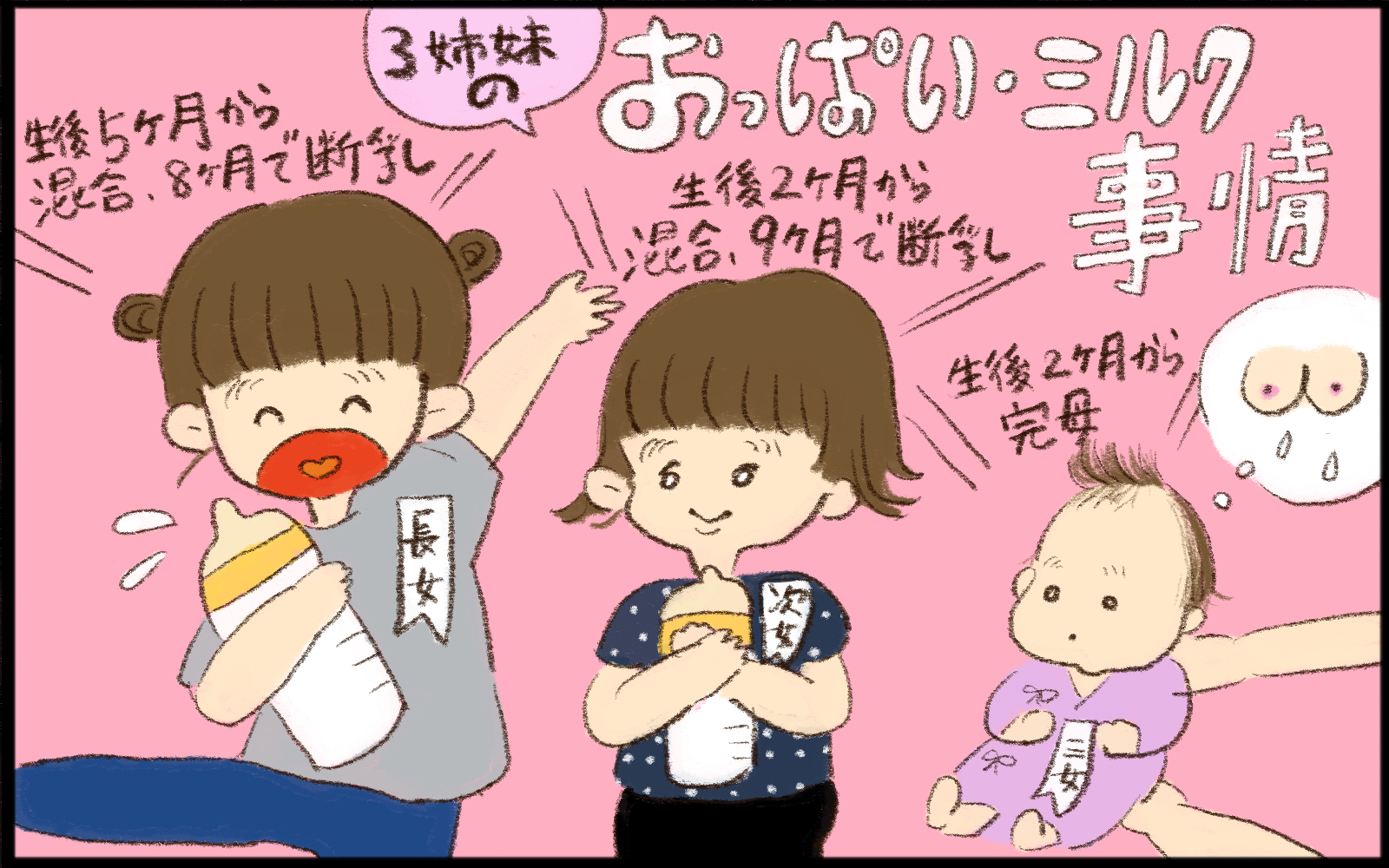 突然ですが三女しーちゃんは新生児のころから混合育児をしていましたが、なぜか最近ミルクを飲まなくなりました…。今回はひとりひとり違う3姉妹の授乳エピソードをお話します。