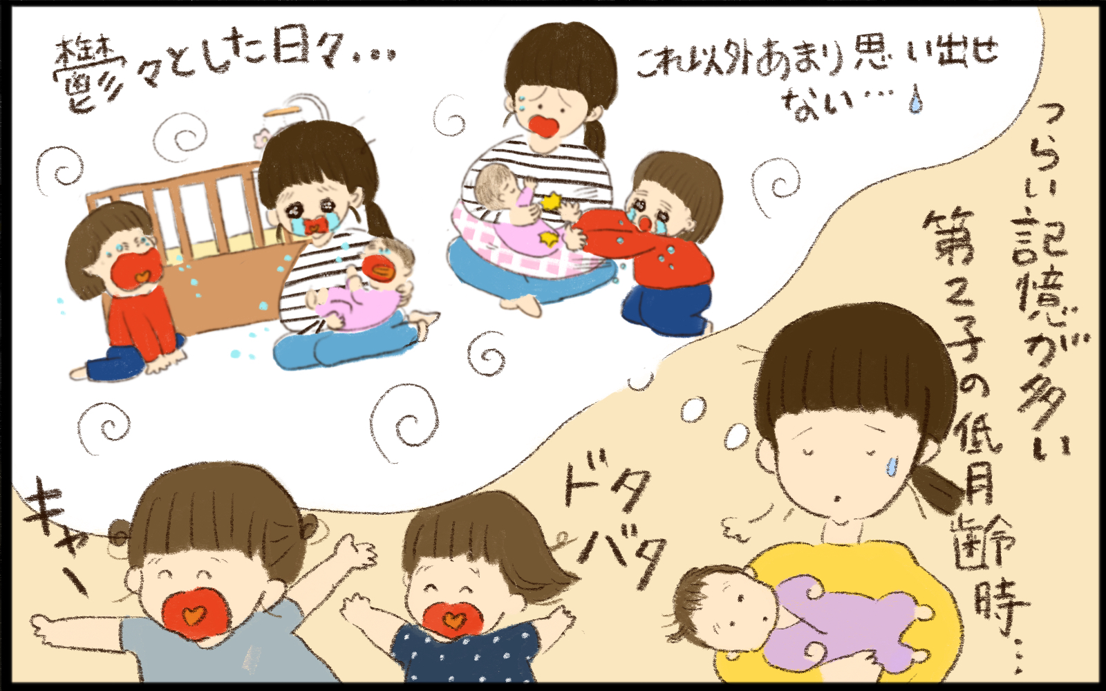 また、れーちゃんにおっぱいをあげるたび、さっちゃんは泣いて嫌がりました。年子育児では妹が生まれたとしても、お姉ちゃんもまだまだ赤ちゃんです。生まれたばかりのれーちゃんを押して、身体全体で「いやだ!やめて!」と表現していました。