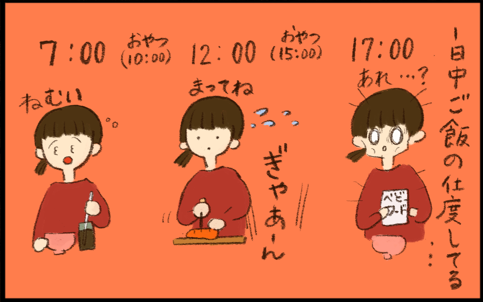 しかしつわり中とはいえ、たとえ1回でも離乳食をお休みするのは抵抗があり、吐きそうになりながらも必死に食事をあげていました。月齢とともに食事の回数が増えていくと「1日中ご飯の仕度してる!」とヒーヒー言っていたのを思い出します。