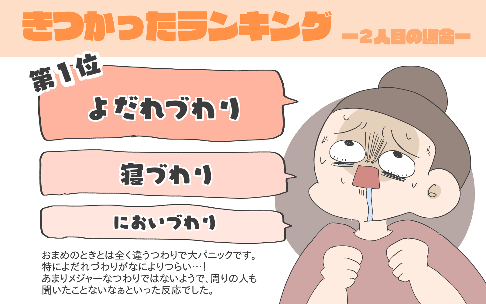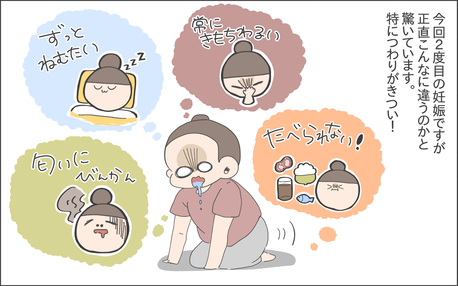 二人目を妊娠中のおかめさんは、おまめくんのときとは違い、よだれづわりに悩まされているようです。第一子のときとまったく症状が違うと、第二子でもまるで初産のような気持ちになってしまいそうですね。