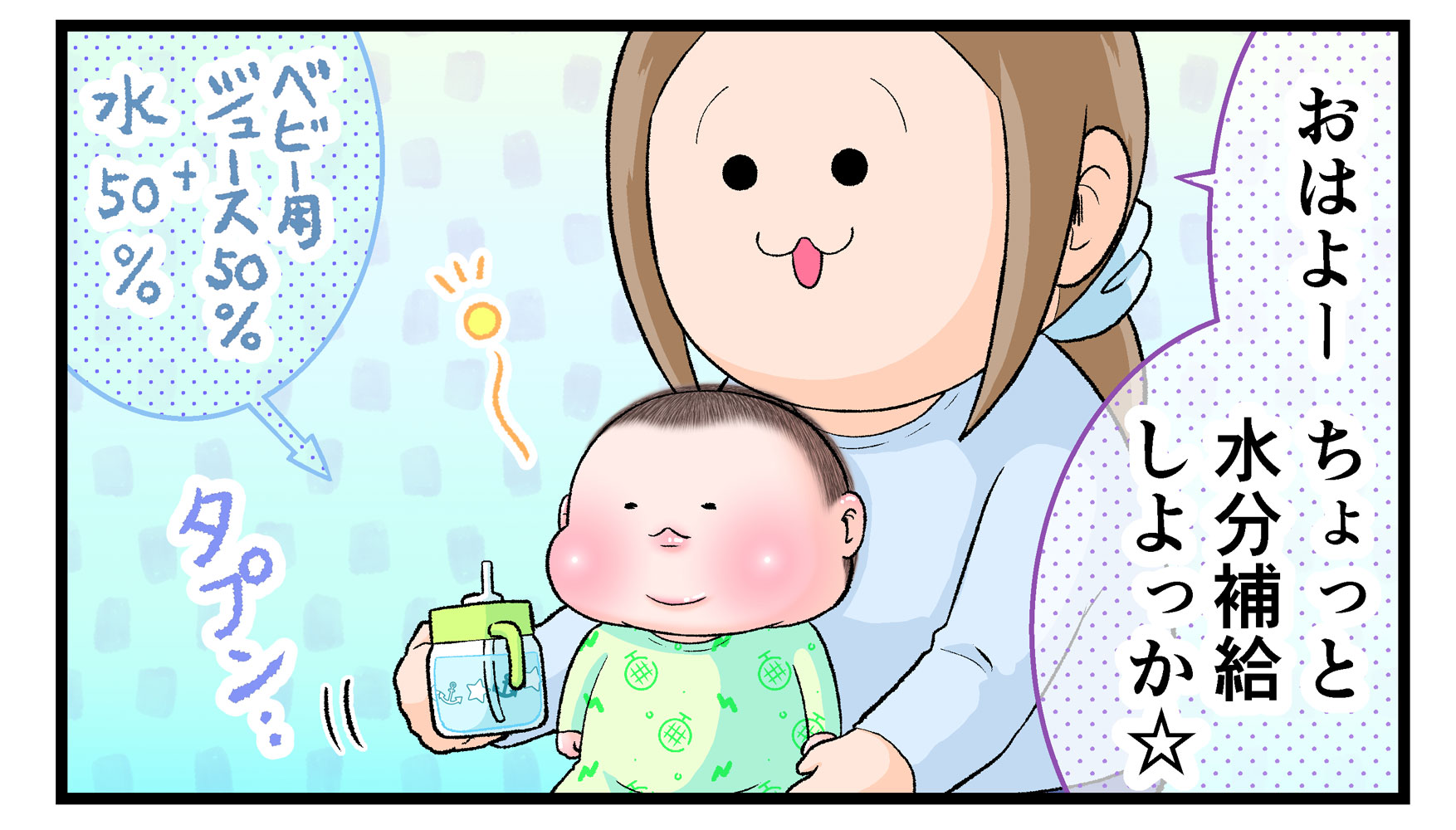 寝起きに飲み物を渡され、最初は「ちゅー」とかわいらしくストローマグを吸っていたぷにおくん。しかし、本当に喉が渇いていたのか、飲料の味をしめたのか(ベビー用ジュース50%+水50%にも注目です)…最後は「ゴッキュ!ゴッキュ!」となんとも力強い飲みっぷりを見せてくれました。