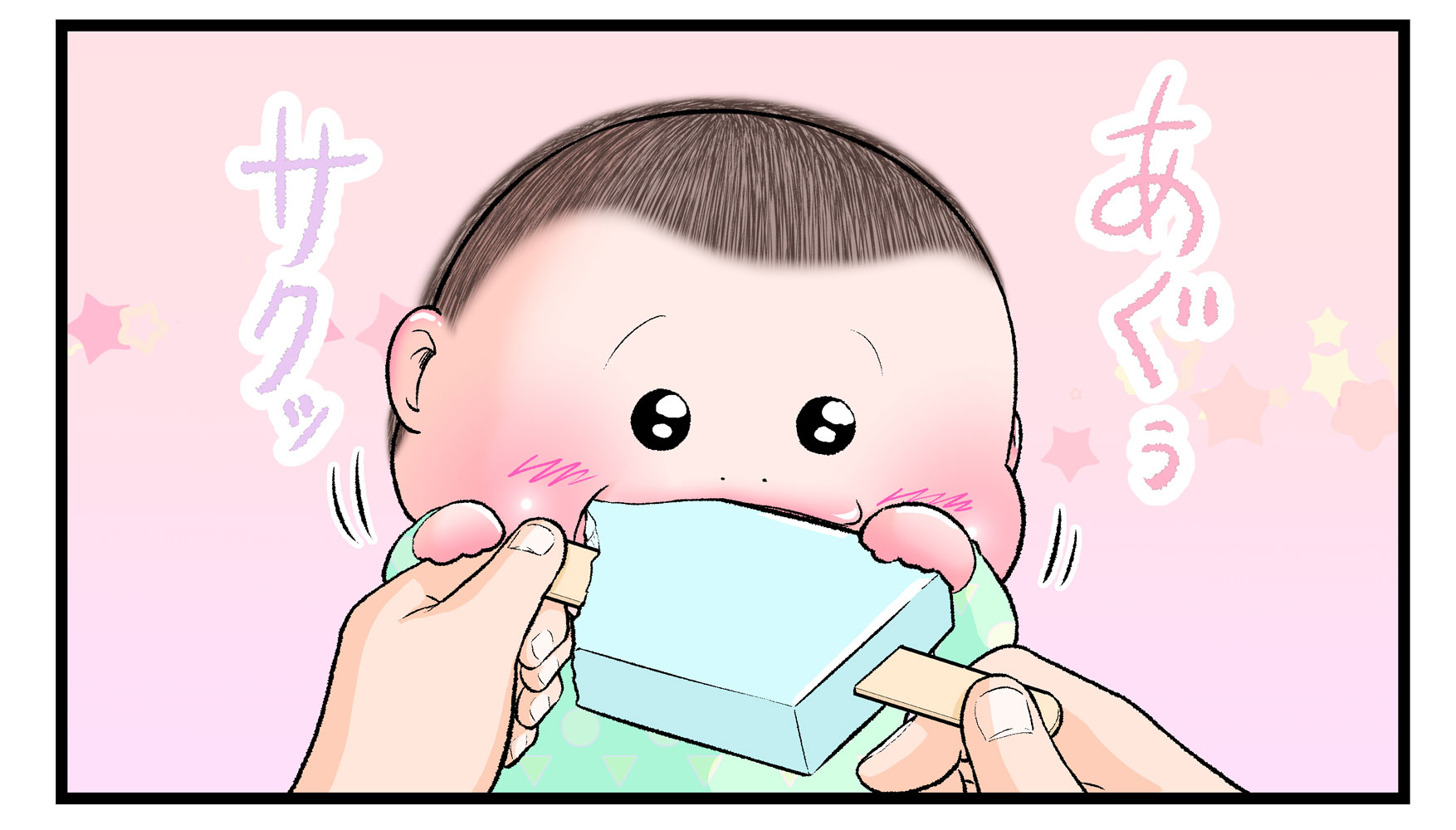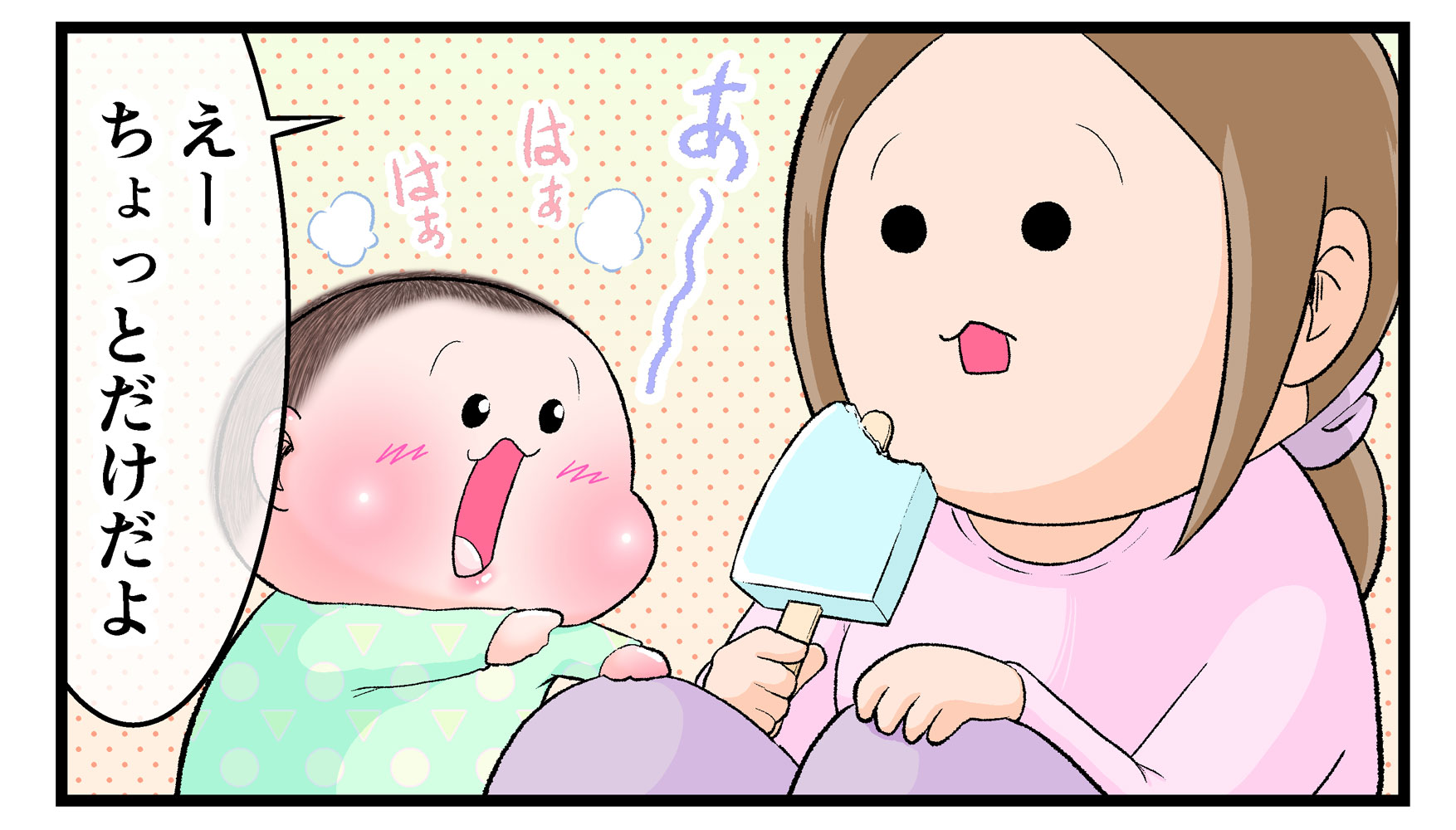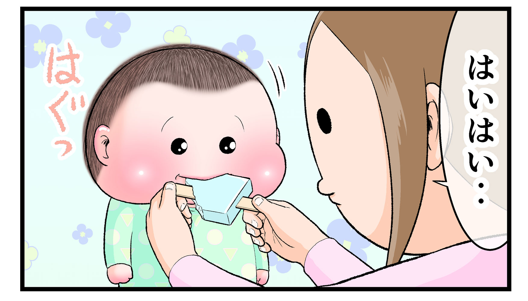 ※こちらは食べ物に興味を示す赤ちゃんのかわいらしさを描いた漫画です。ママとおやつなどをシェアする際に虫歯菌などが気になる場合は、個々の判断でご対応ください。