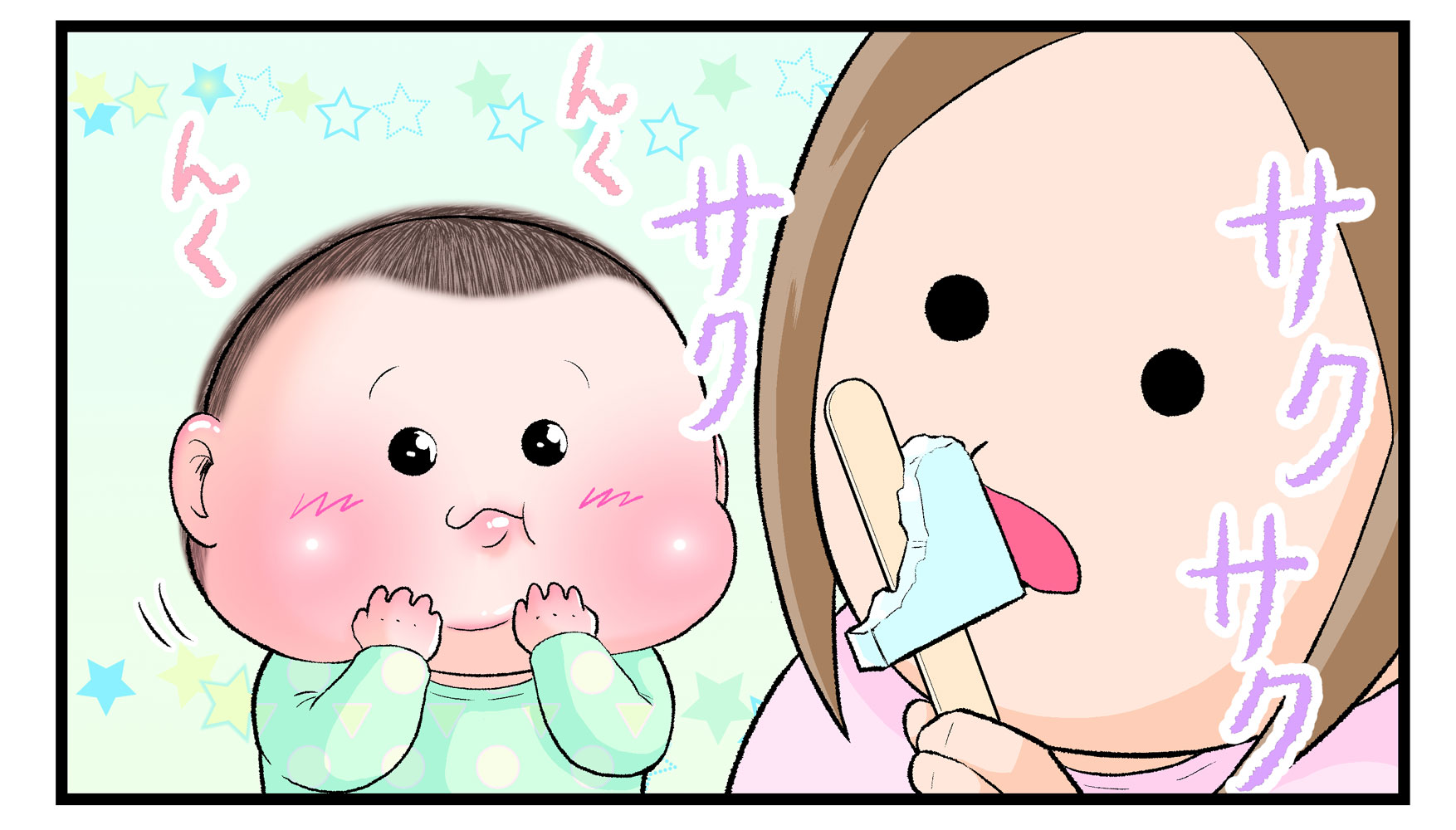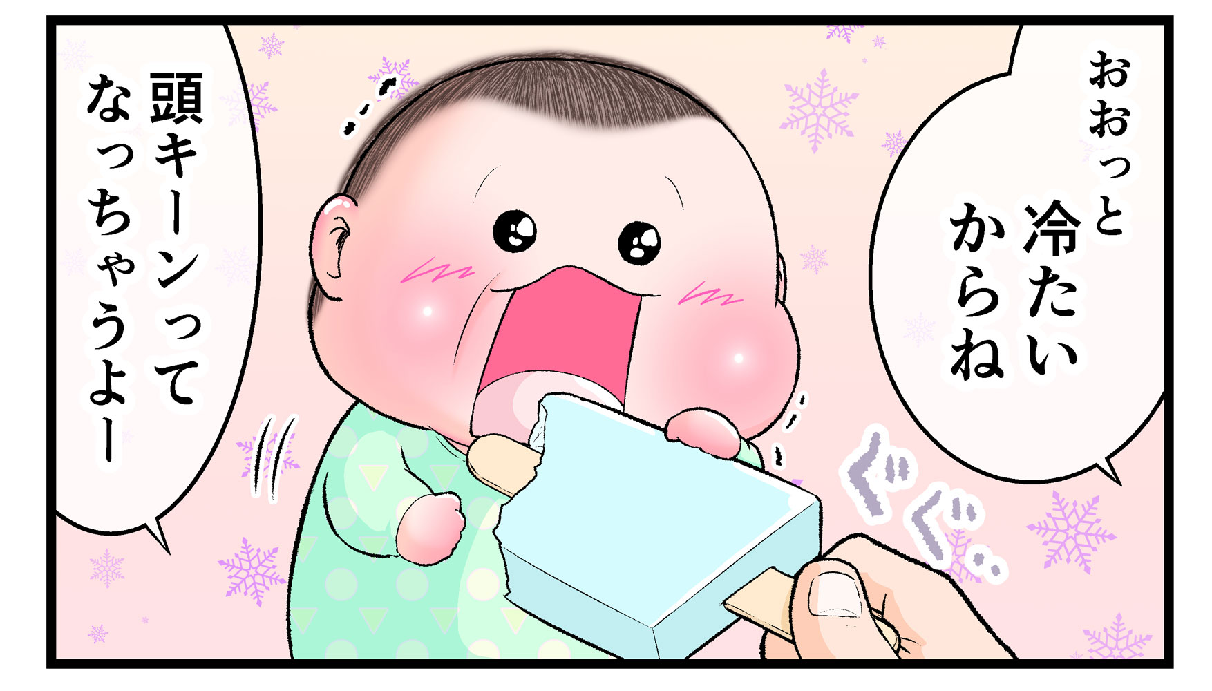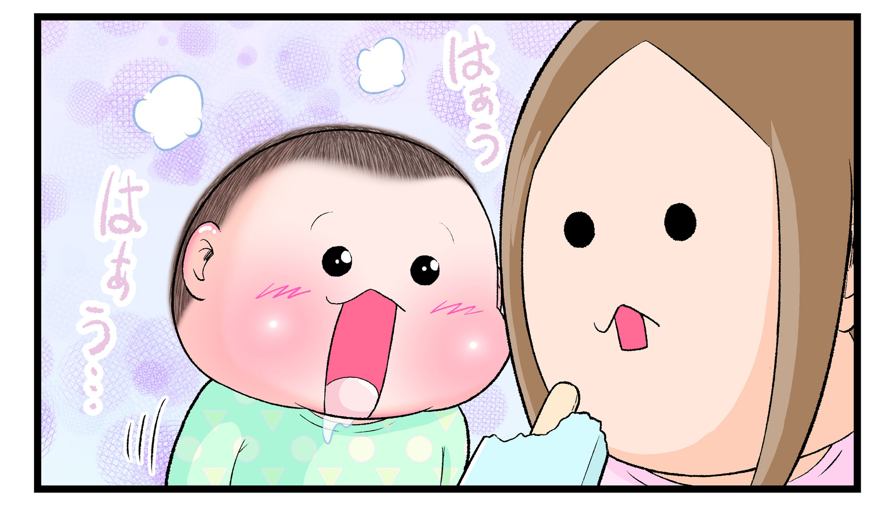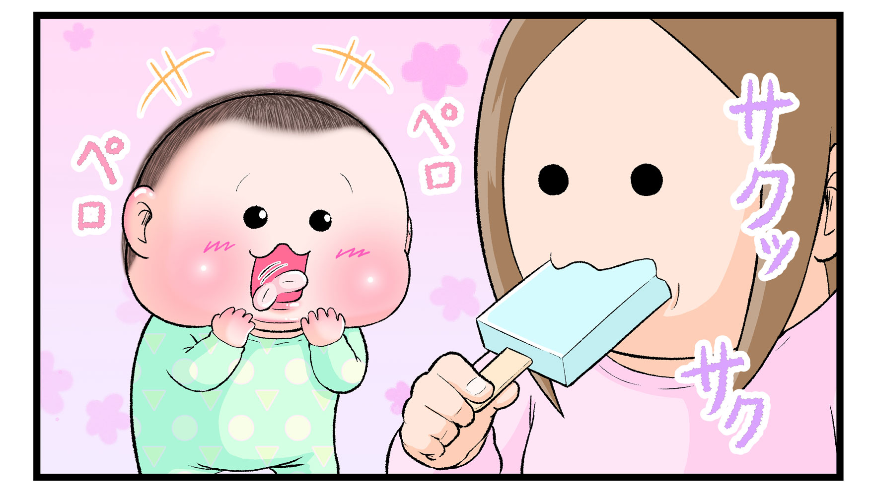 ※こちらは食べ物に興味を示す赤ちゃんのかわいらしさを描いた漫画です。ママとおやつなどをシェアする際に虫歯菌などが気になる場合は、個々の判断でご対応ください。