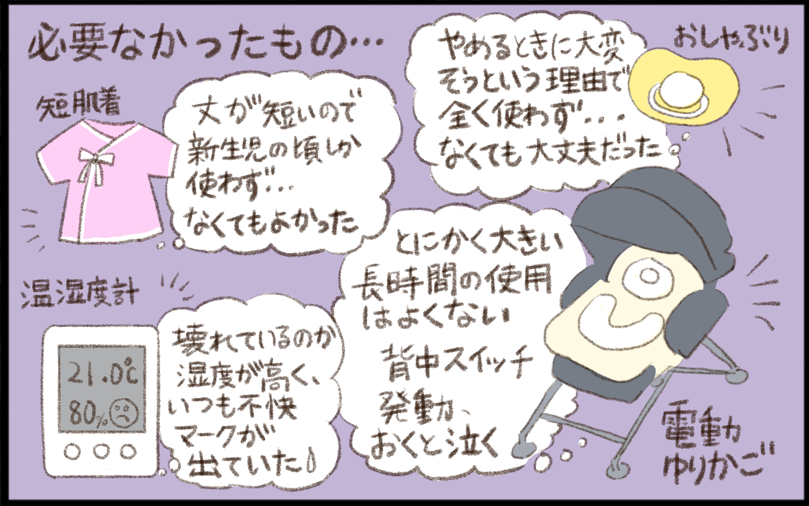 大きな育児グッズだと、電動ゆりかごが必要なかったかもしれません。赤ちゃんをずっと寝かせておけるものではないし、電動ゆりかごで寝かせると逆に泣いてしまうことが多かったです。ねんねの時期以外はあまり使用することがなく、我が家の物置行きになりました。ただ、家事の合間など、主に料理中の短い時間に使用する場合には助けられていました。泣いていても、ゆりかごに揺られているあいだに少しでも眠ってくれるのは、電動のいいところです。