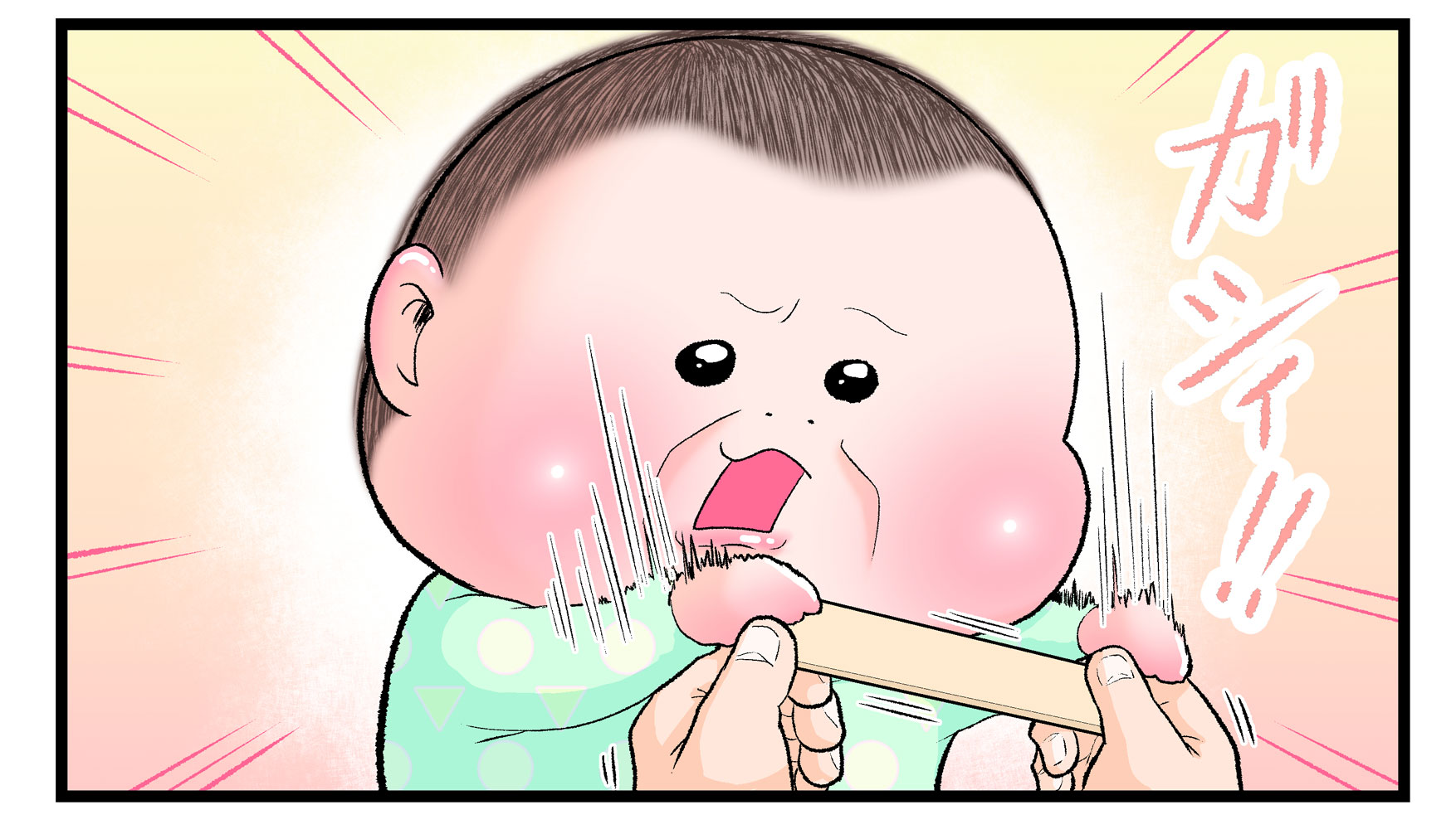 ママもアイスの棒が赤ちゃんの喉などにつかえないように、棒の端をしっかりと握っていますね。赤ちゃんとおやつを食べたら、歯磨きも忘れずにしてあげましょう。