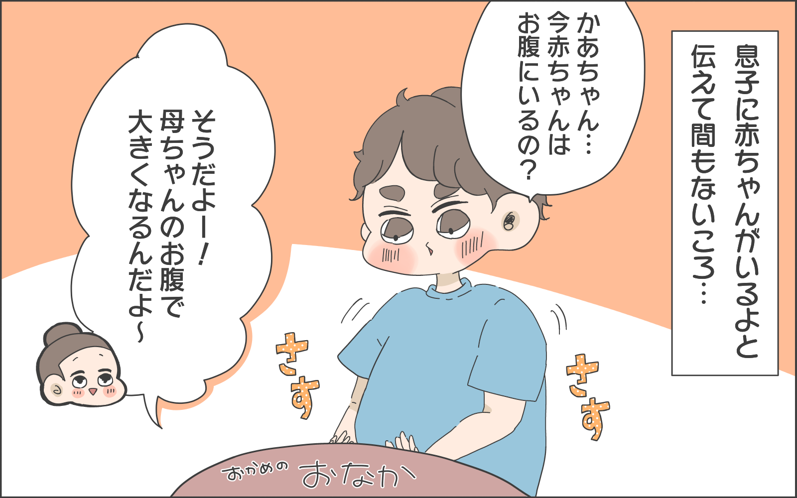 育児マンガ家おかめ(@omame_okame)さんの日常の出来事や奮闘をマンガでお届けします。お腹の中に赤ちゃんがいると知ったときの上の子の反応はさまざまです。知った後もしばらくは泣いたり甘えたりする子もいるでしょう。今回は、赤ちゃんがいると伝えてしばらくたった後のおまめくんの様子を描いていただきましたよ。