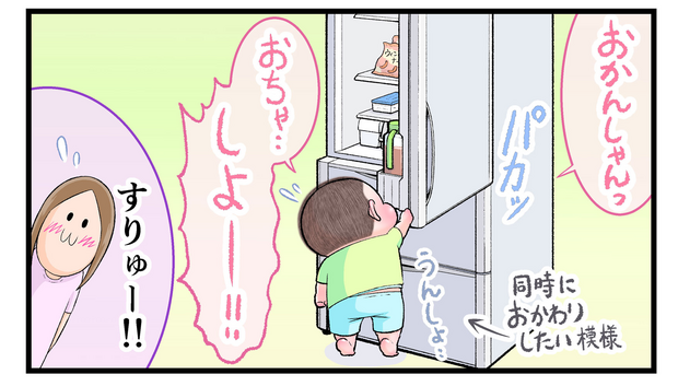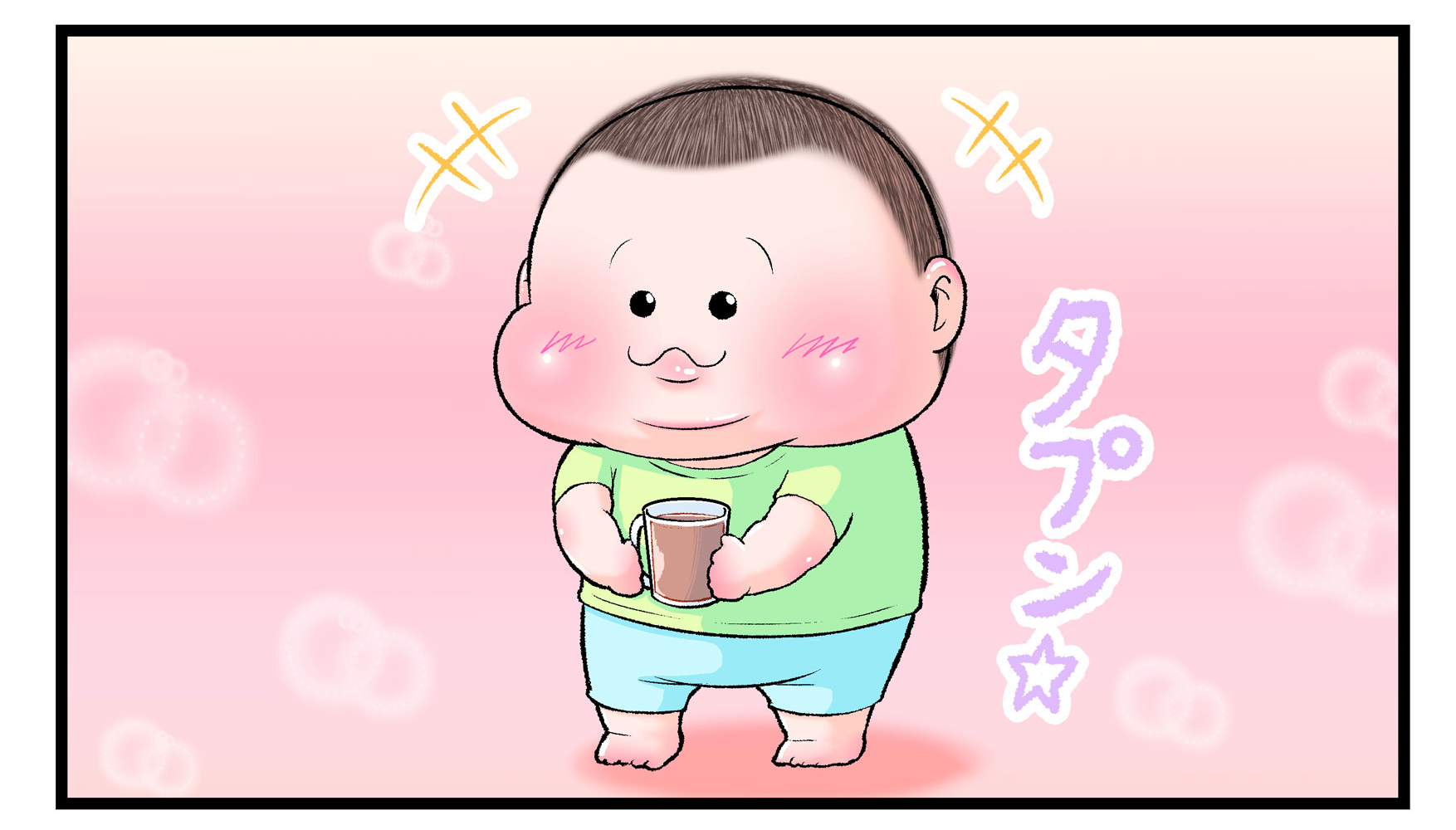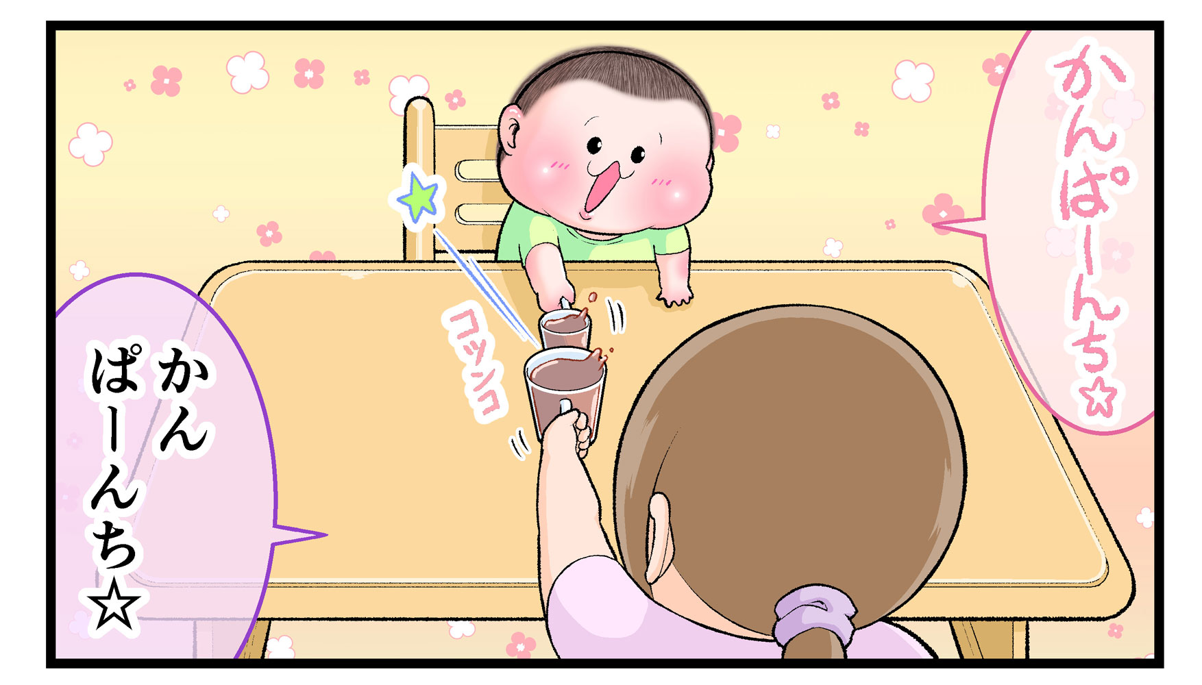 ぷにおくんからのお茶のお誘い、とても嬉しいですね。「かんぱーんち」というヒーローの必殺技のような乾杯の音頭も、2歳児らしい言葉づかいです。「おかんしゃん(おかあさん)」や「おちゃ、しよ」という言葉も、一生懸命さが感じられてとてもかわいらしいですね。