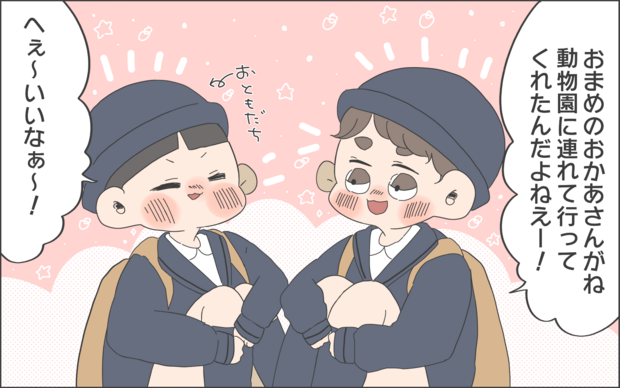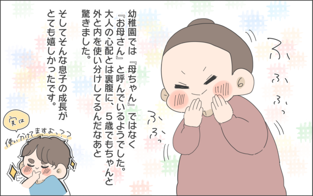 おかめさんの息子・おまめくんは、家で「母ちゃん」「父ちゃん」と呼んでいたのですね。しかし幼稚園では「おかあさん」と呼んでいたとか。5歳の子どもも外と内で使い分けていたことに、ままのて編集部員たちも驚きを隠せませんでした。