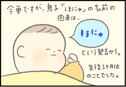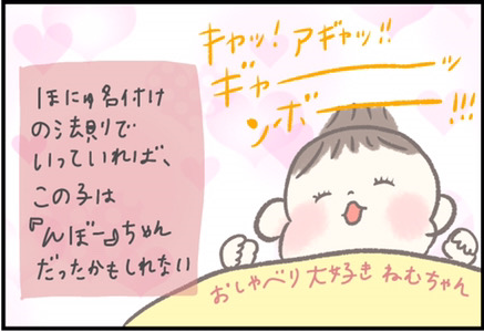 つぶみさんのご家庭では、上の子・ほにゅくんは喃語(なんご)からあだ名を名付けたとのこと。しかし、ほにゅくんの名付けの法則でいえば、下の子・ねむちゃんは、もしかしたら「んぼーちゃん」になっていたかも…と思うと面白いようなとてもかわいらしいような気がしますね。