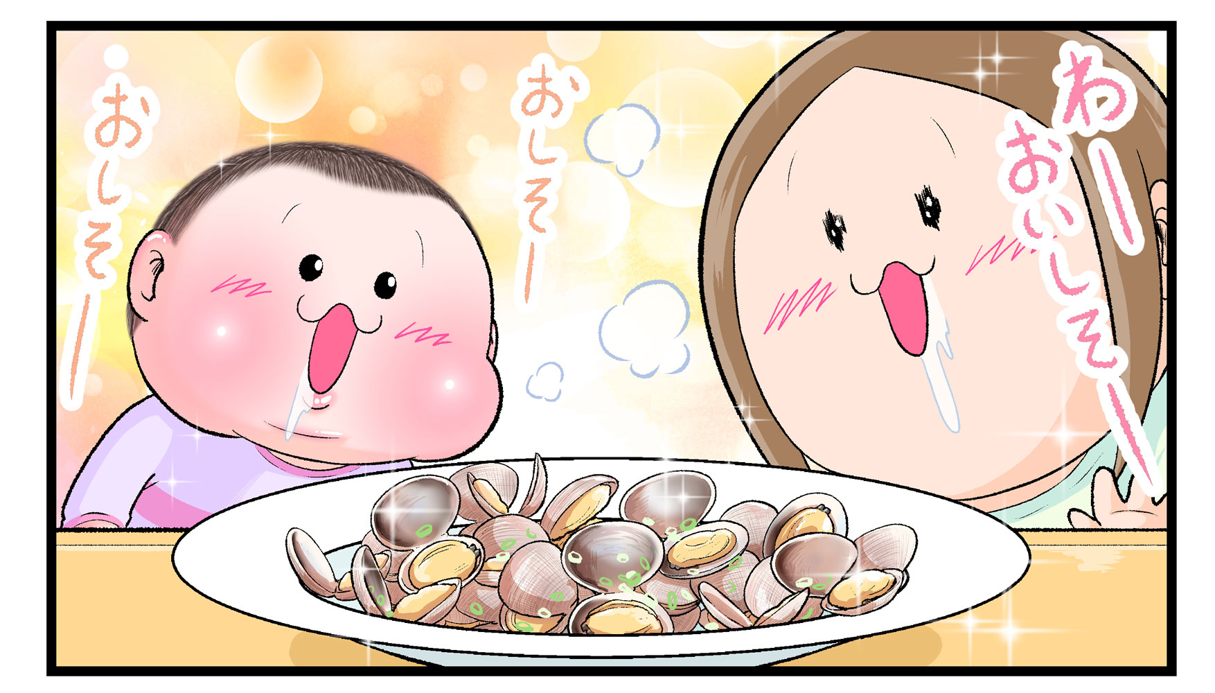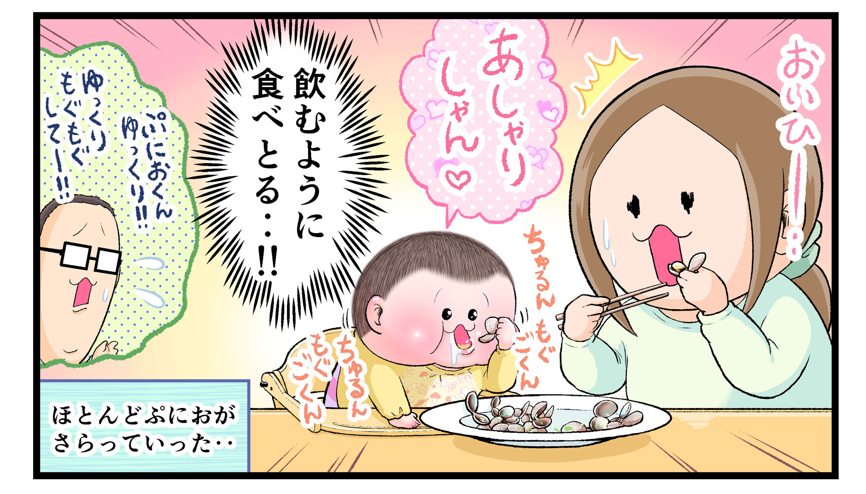 そして何より「アサリの酒蒸しを作ってみよう」と提案したり「ぷにおくんゆっくりもぐもぐして~」と焦ったりするパパが、とても子煩悩だなと感じた回でした。