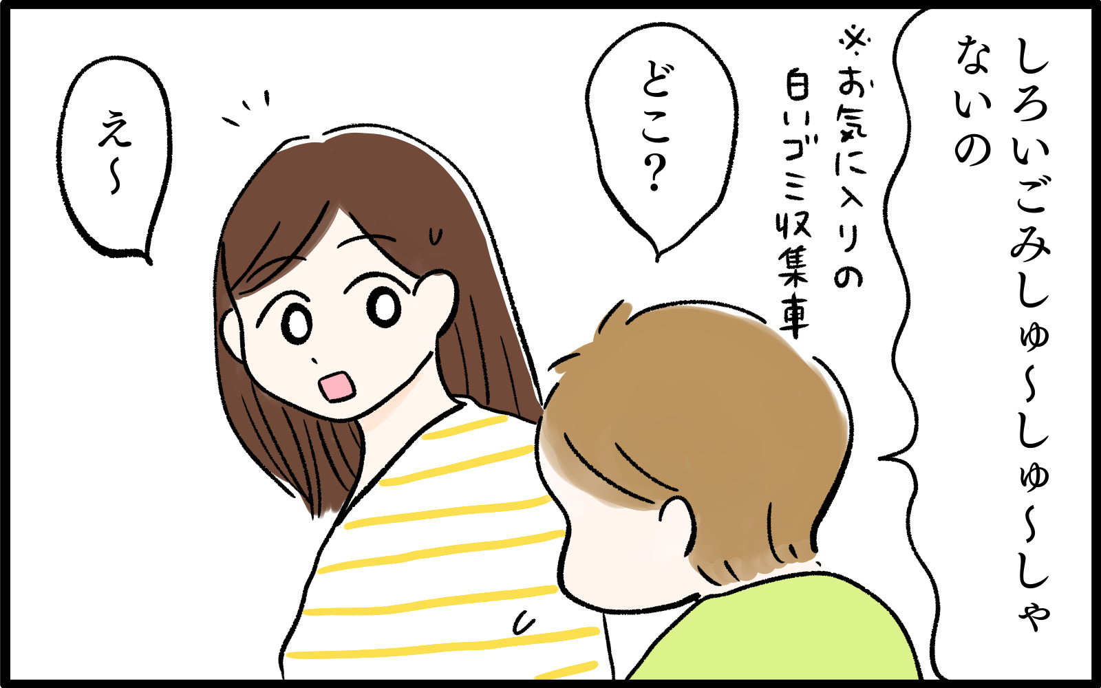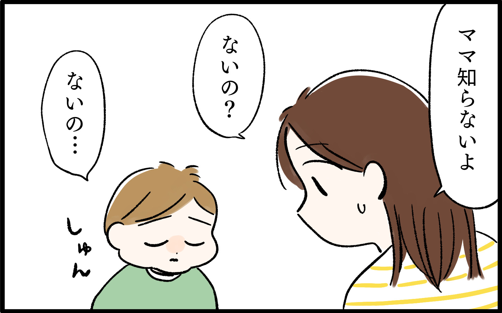 chiikoさんの息子・ぐっちゃんは、白いゴミ収集車のおもちゃが好きなのですね。なくしてしまってシュンと落ち込んでいる姿が、なんともかわいそうです。しかし、ぐっちゃんはめげません。ママに「探してみ?」と言い放つ姿に、思わずふきだしてしまいました。