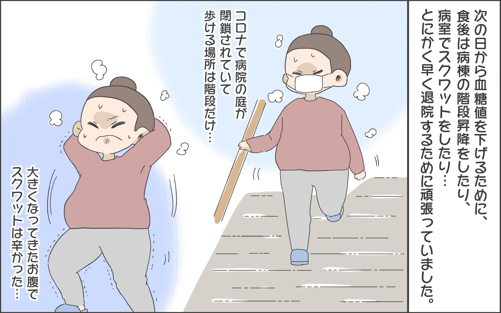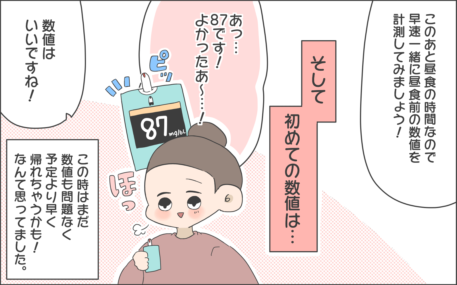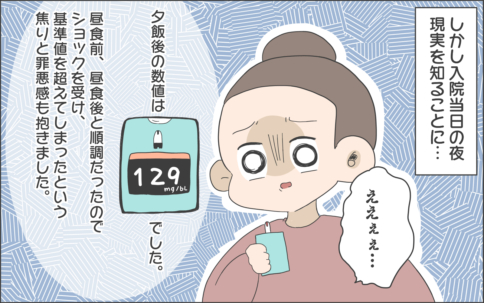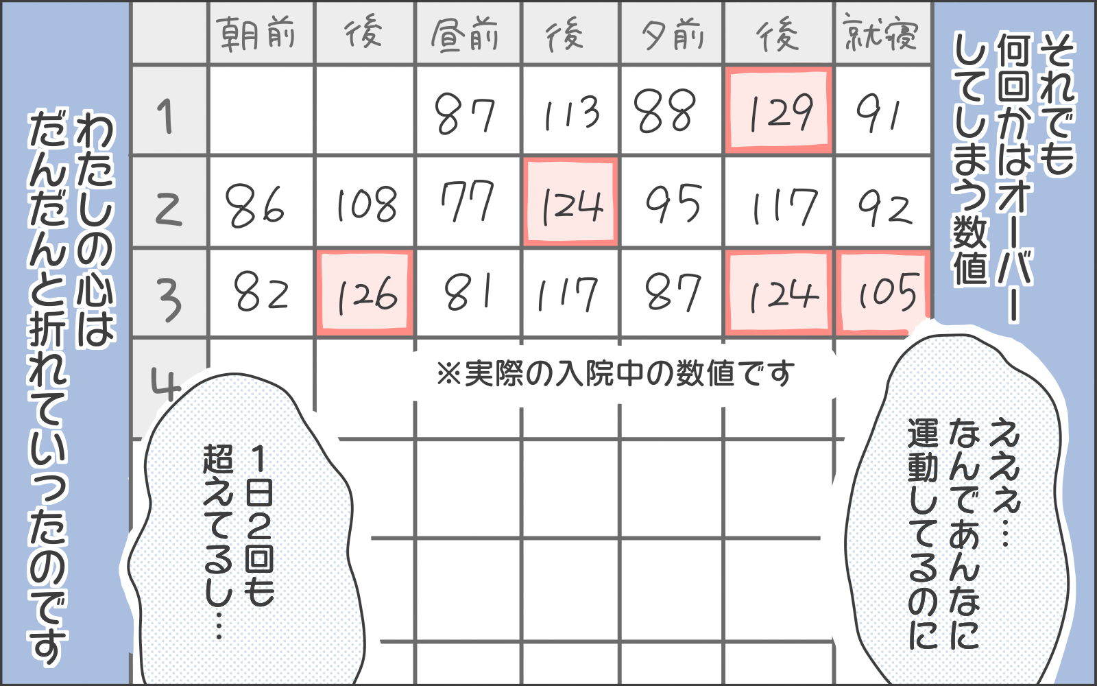 そして入院初日の自己計測は順調…、かと思いきや基準値を超えた数字に唖然とするおかめさん。運動をしても基準値を超えてしまう、努力が結果として表れないときはとてもつらいですし、投げやりな気持ちになってしまいますよね。